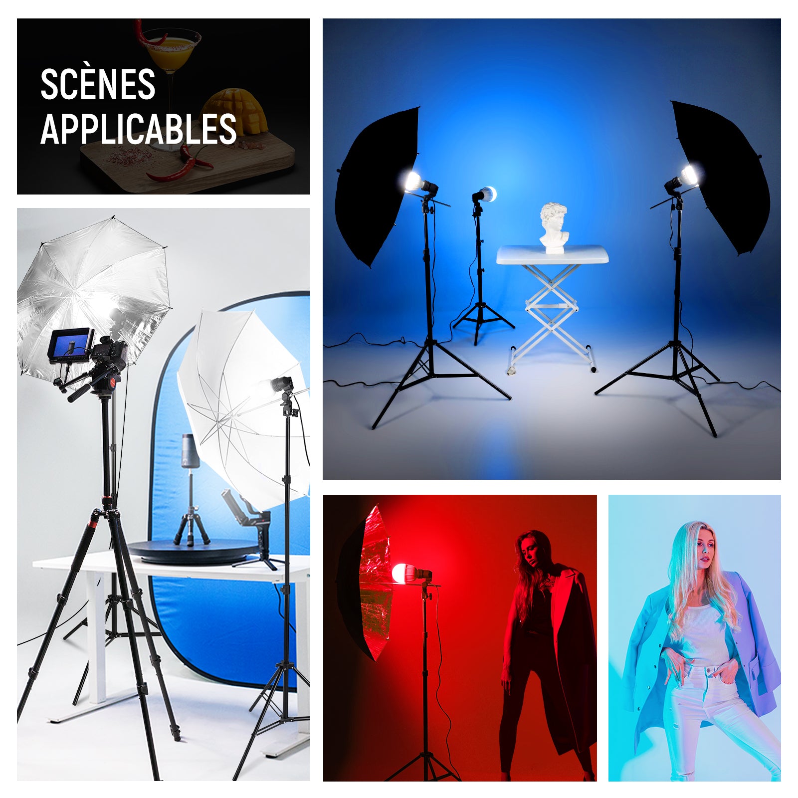 • 【Sacs portables et de protection】 2 sacs de transport sont inclus. Le grand sac peut contenir des supports d'éclairage, des parapluies et des attaches de câble, et le petit sac stocke en toute sécurité 3 ampoules LED pour éviter les collisions et les bris