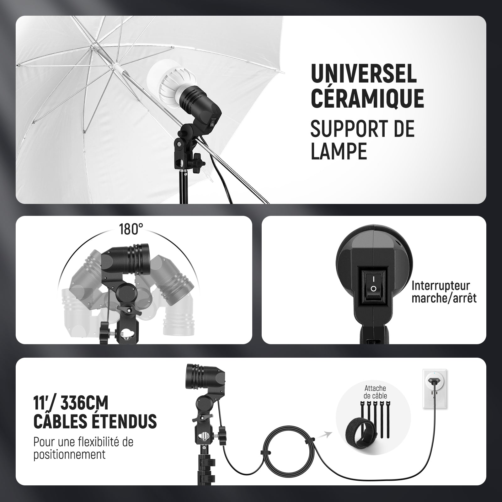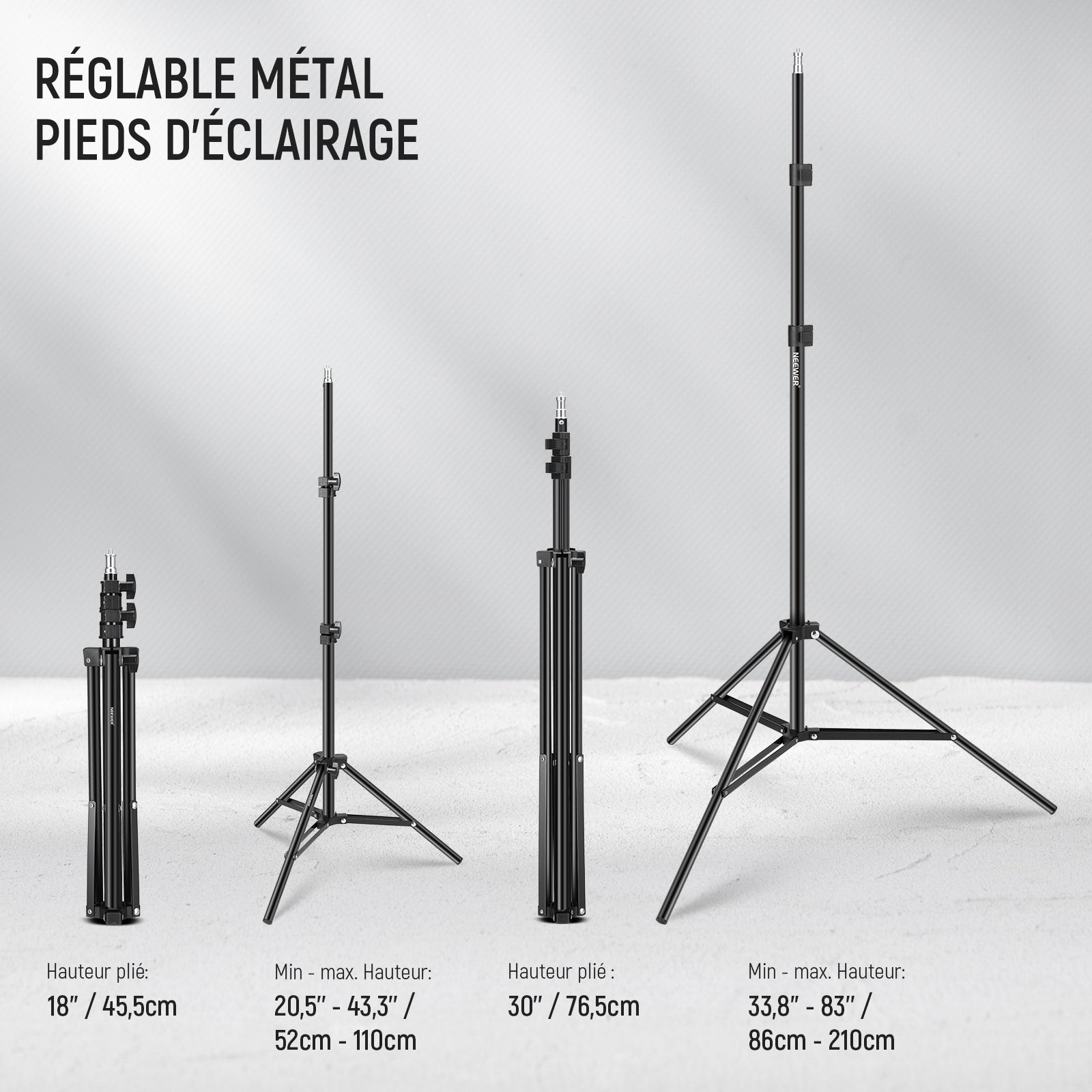 • 【Supports de lumière en métal réglables】 3 supports de lumière sont inclus. 2 pieds d'éclairage hauts à 3 sections offrent une hauteur maximale de 83" (210cm), et le pied d'éclairage court à 2 sections peut s'étendre jusqu'à 43,3" (110cm) pour un éclairage dans des positions basses. Des douilles d'ampoule E26 sont incluses et des câbles prolongés de 11' (336cm) vous permettent de déployer l'éclairage facilement