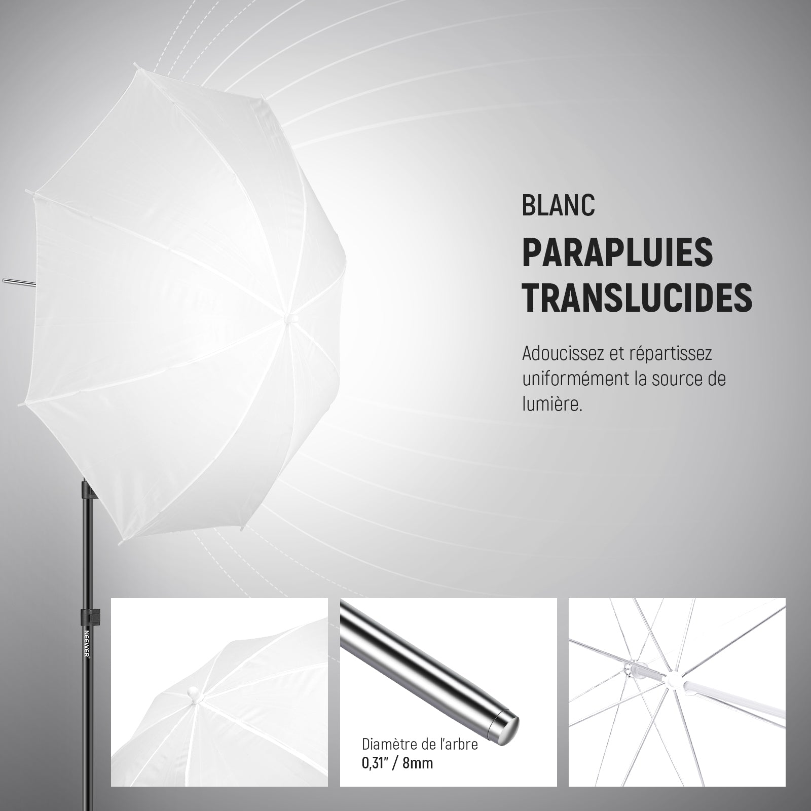 • 【Parapluies pour la réflexion et la diffusion de la lumière】 les parapluies noirs de 83,8cm avec intérieur argenté sont utiles pour le rebond et la réflexion de la lumière, et les parapluies blancs translucides peuvent adoucir la source de lumière et la diffuser avec une répartition uniforme