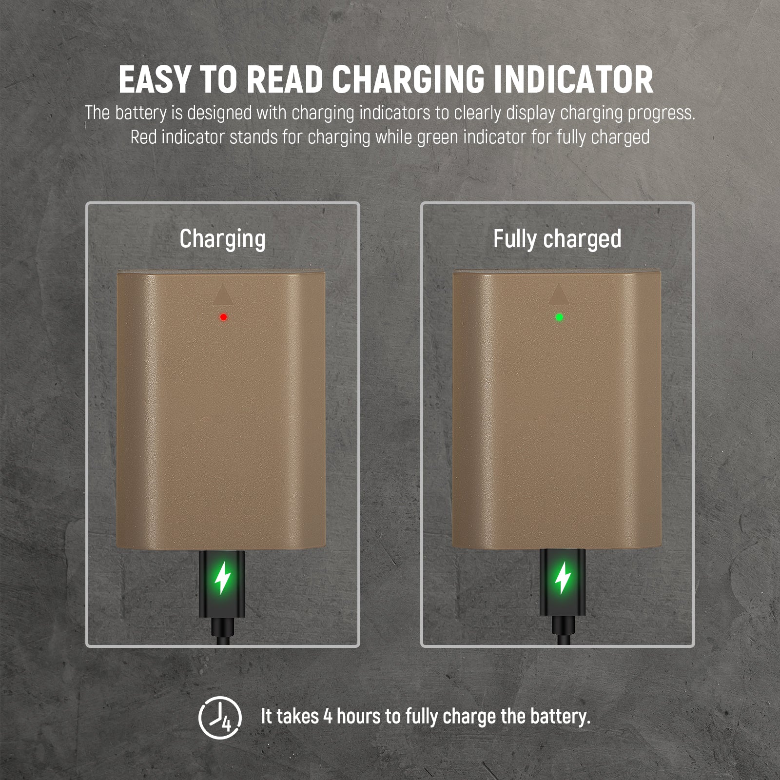 - Indicateur de Charge Facile à Lire - La batterie est conçue avec des indicateurs de charge pour afficher clairement la progression de la charge. L'indicateur rouge signifie que la batterie est en cours de charge, tandis que l'indicateur vert signifie qu'elle est complètement chargée.