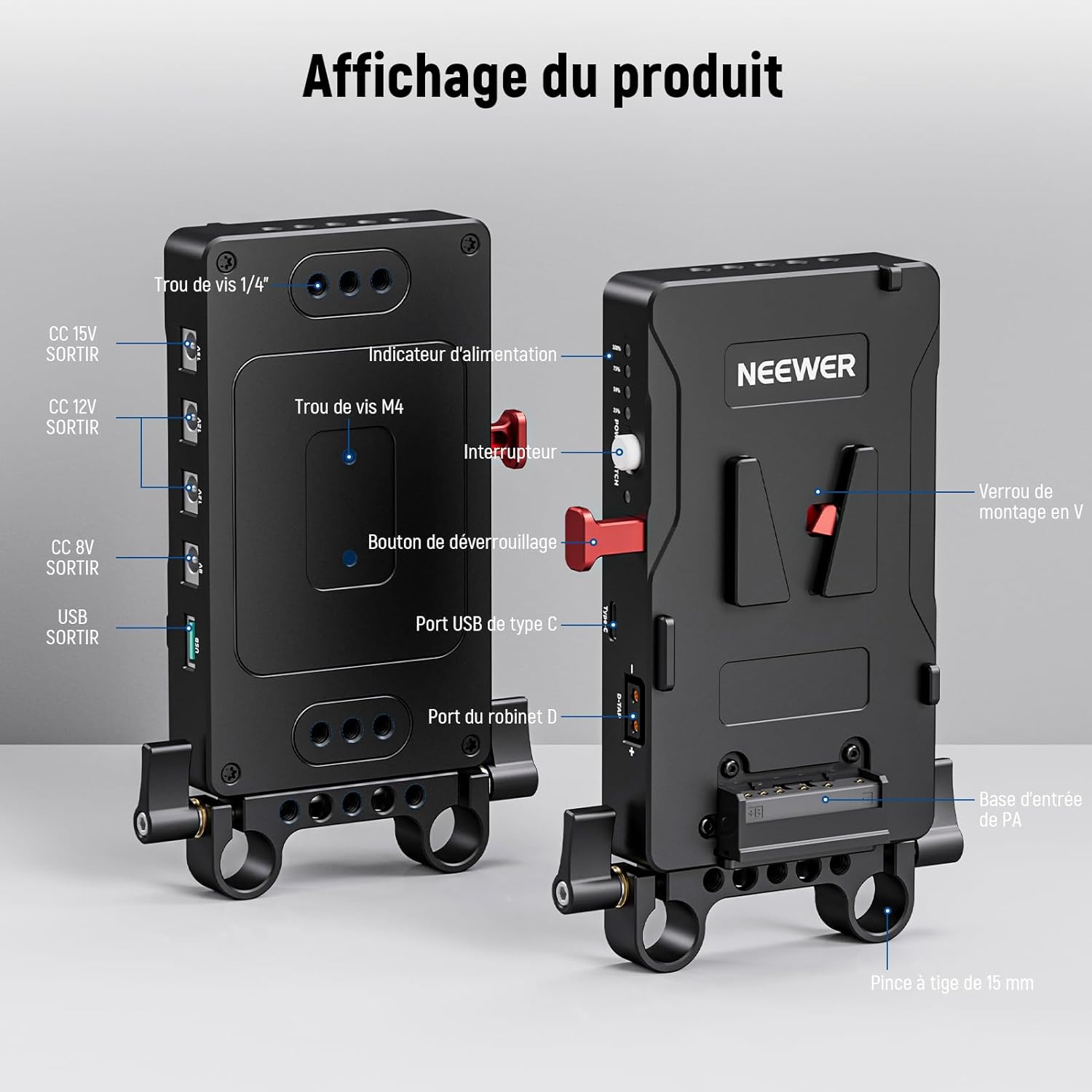 • 【Sorties de tension multiples】Dispose de ports de sortie DC12V (2 ports), DC8V, USB A, USB Type C, D-TAP 14,8V et DC15V pour charger simultanément plusieurs appareils, tels que des appareils photo reflex numériques, des caméscopes, des ordinateurs portables, des tablettes, des smartphones, des microphones , moniteurs de terrain et lampes vidéo LED. Un bouton de dégagement rapide permet une installation facile des batteries à montage en V