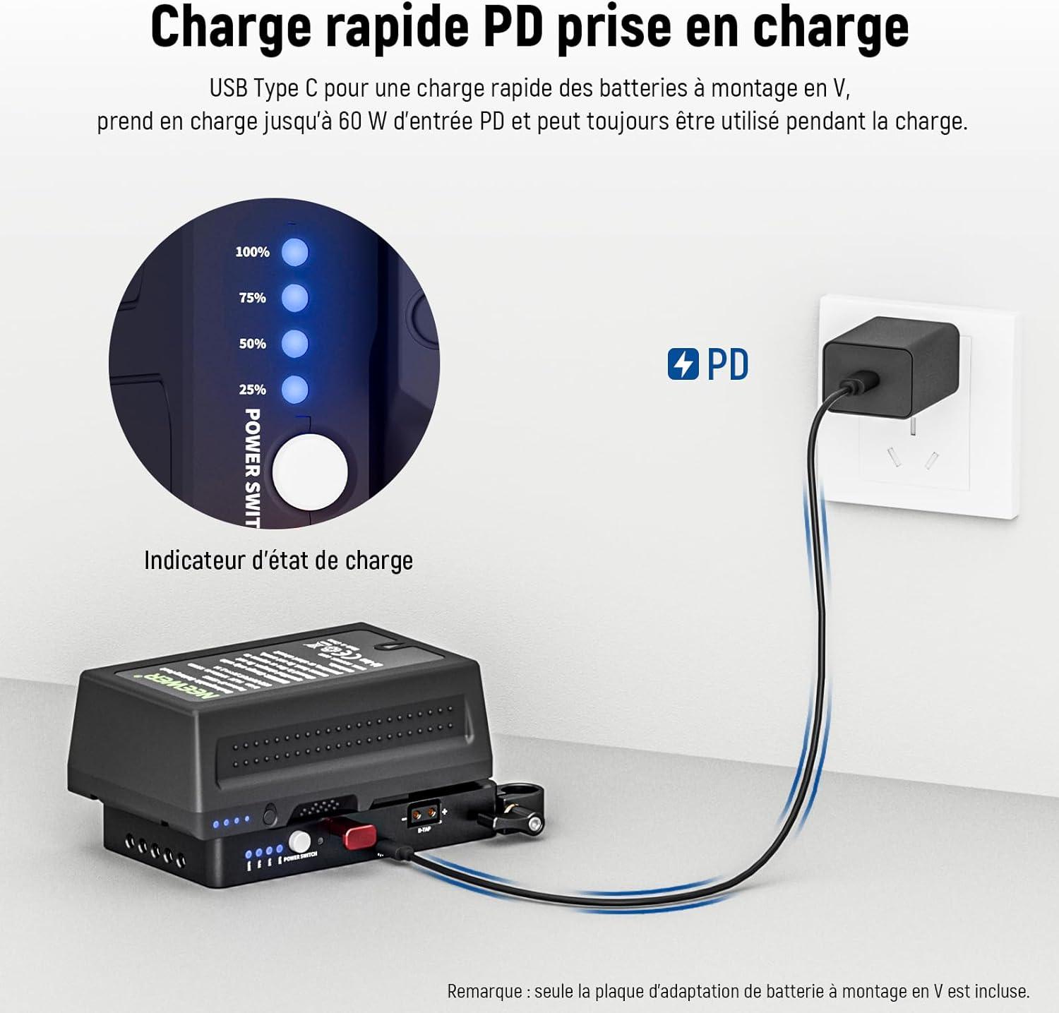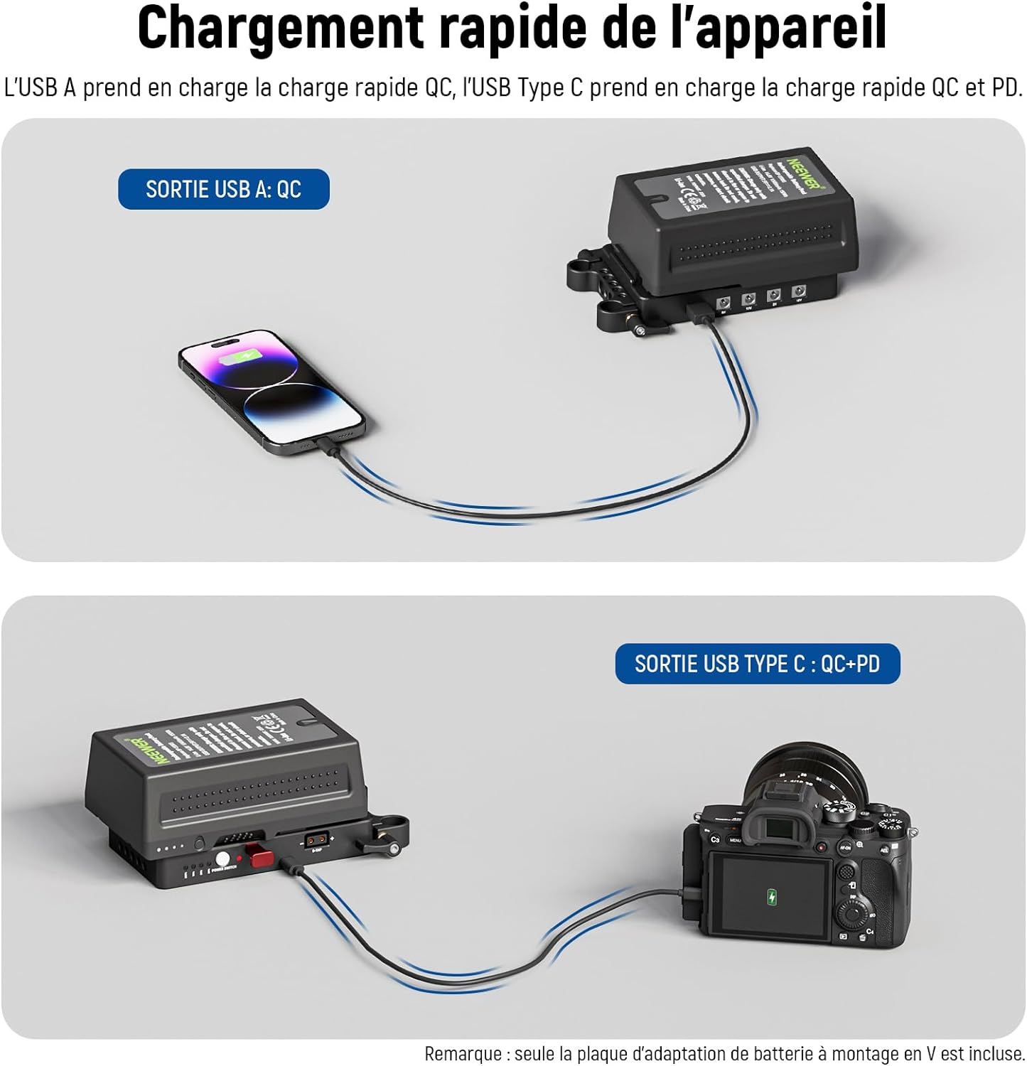 • 【Charge rapide bidirectionnelle PD60W】 Le port USB de type C prend en charge la charge rapide QC et PD avec une entrée et une sortie PD60W maximales, pour une charge rapide de vos smartphones, tablettes ou ordinateurs portables, même avec la possibilité de charger une batterie V Mount lorsqu'elle est en utiliser ou charger via un adaptateur secteur. Le port USB A prend en charge la charge rapide QC