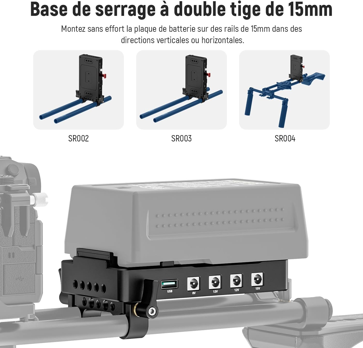 • 【Pinces à double tige de 15 mm】Comprend une base de pince à double tige pour monter la plaque de batterie sur des rails de 15mm pour une utilisation verticale ou horizontale, compatible avec les plates-formes d'épaule SmallRig et NEEWER SR001 SR002 SR003 SR004. Livré également avec un certain nombre de trous de vis 1/4" et un trou fileté M4 pour fixer des lumières LED, des microphones, des moniteurs, des supports, des poignées, etc.