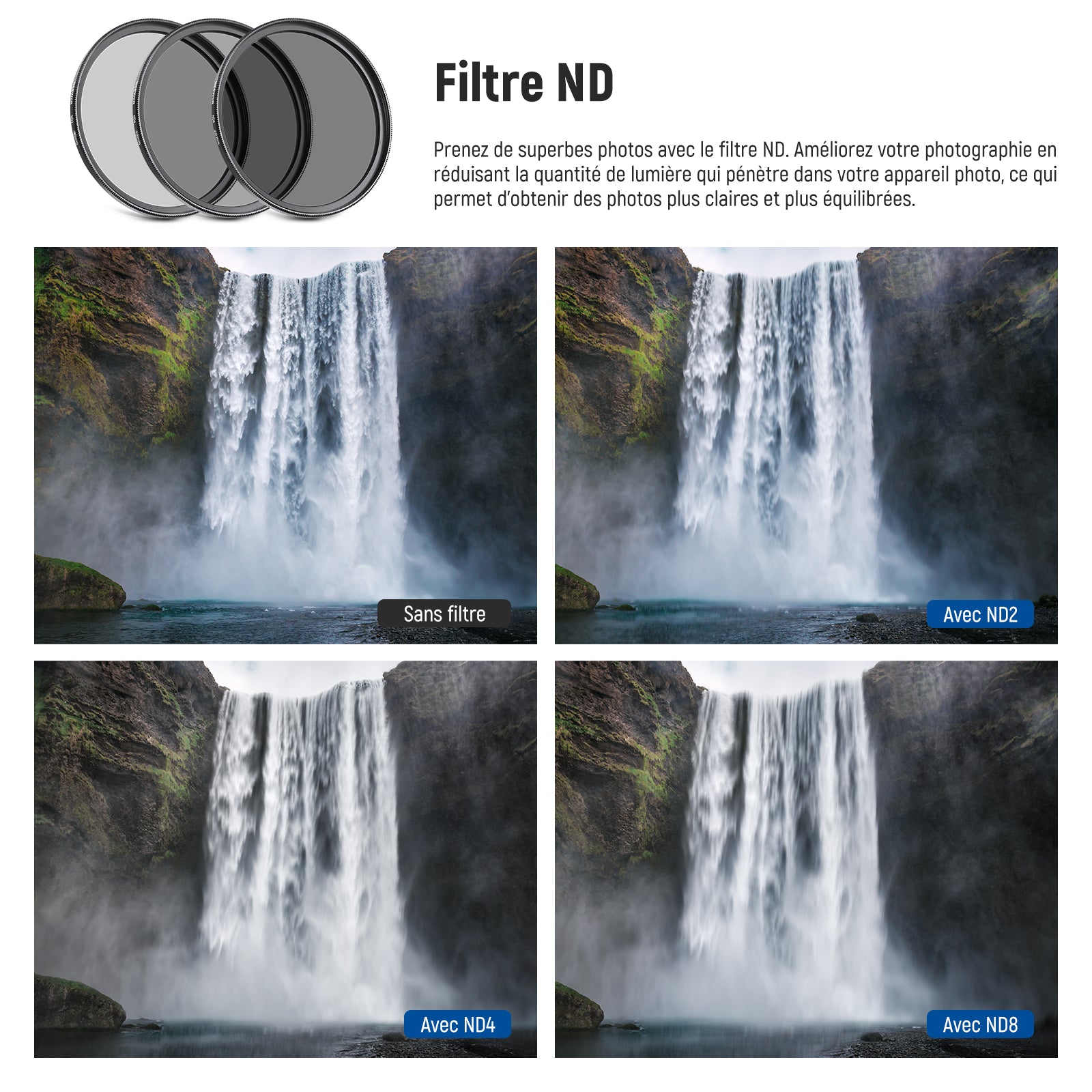 • Exposition équilibrée avec filtres ND : les filtres à densité neutre réduisent la quantité de lumière entrant dans le capteur de l'appareil photo de différents degrés, ND2 de 1 arrêt, ND4 de 2 arrêts, et ND8 de 7 arrêts, pour obtenir une exposition équilibrée sur les images dans différentes conditions de lumière. Ces filtres ND permettent également des prises de vue à longue exposition en ralentissant la vitesse d'obturation