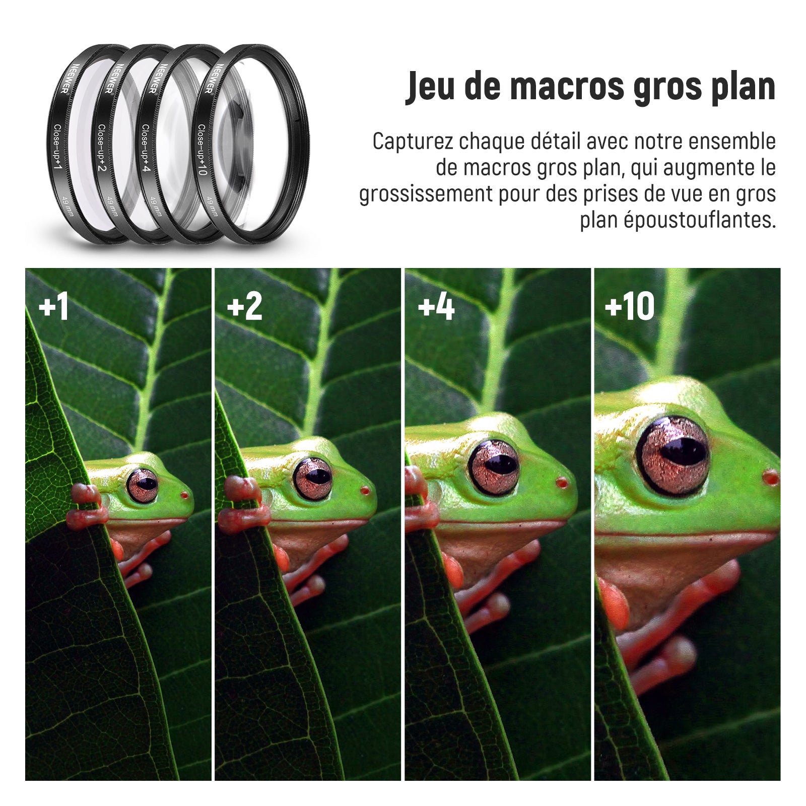 • Filtres gros plan pour photographie macro : les filtres macro gros plan grossissent votre sujet de tournage, tels que les fleurs, les insectes et les pièces de monnaie, de +1, +2, +4 ou +14 fois pour capturer plus de détails, bien adaptés pour la macrophotographie. Il est double filetage pour être utilisé avec d'autres filtres, tels qu'un polariseur. Différents filtres de gros plan peuvent également être empilés en combinaisons