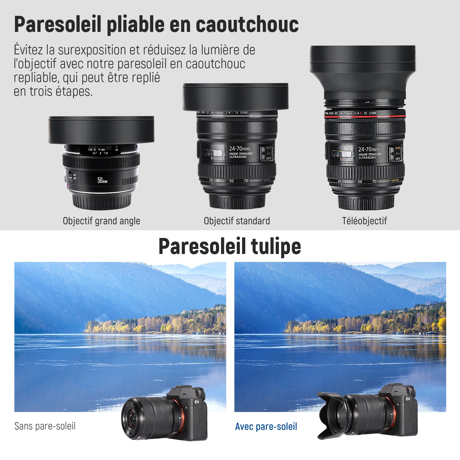 • Deux pare-soleil fournis : un pare-soleil en forme de tulipe et un pare-soleil pliable en caoutchouc aident à bloquer l'excès de lumière du soleil et à réduire l'éblouissement et les reflets. Le pare-soleil pliable en caoutchouc peut être plié en trois formes, tulipe, fleur et pédale, pour une plus grande polyvalence. Le pare-soleil tulipe est bien adapté pour les objectifs grand angle car il ne causera pas de vignettage
