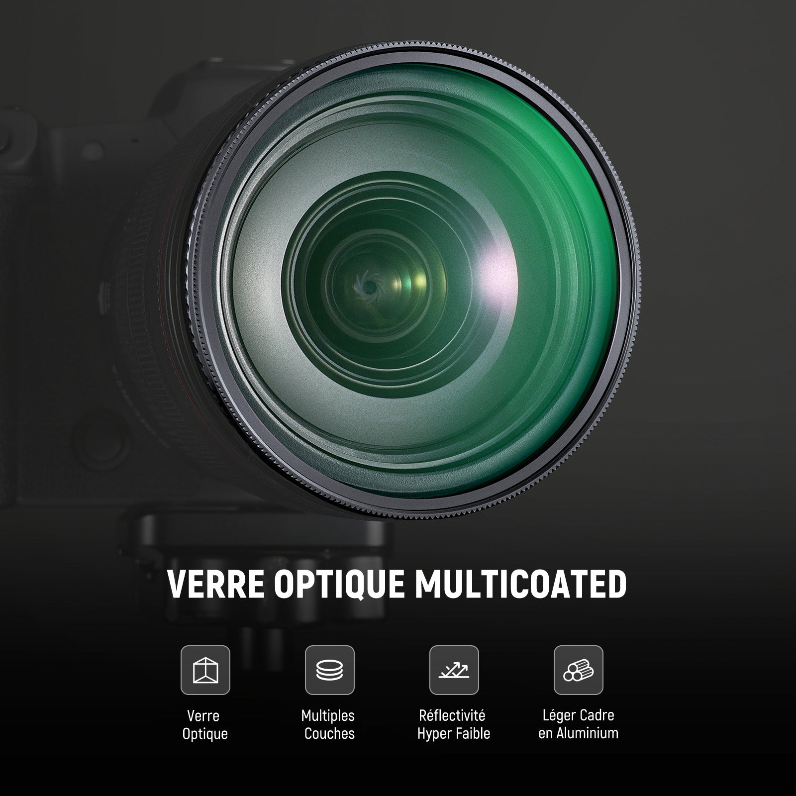 - 【Multiples Revêtements de Protection】 De multiples couches sur les deux faces du verre résistent à l'eau, à la poussière, aux empreintes digitales et aux rayures. Un chiffon de nettoyage inclus permet de garder le filtre impeccable