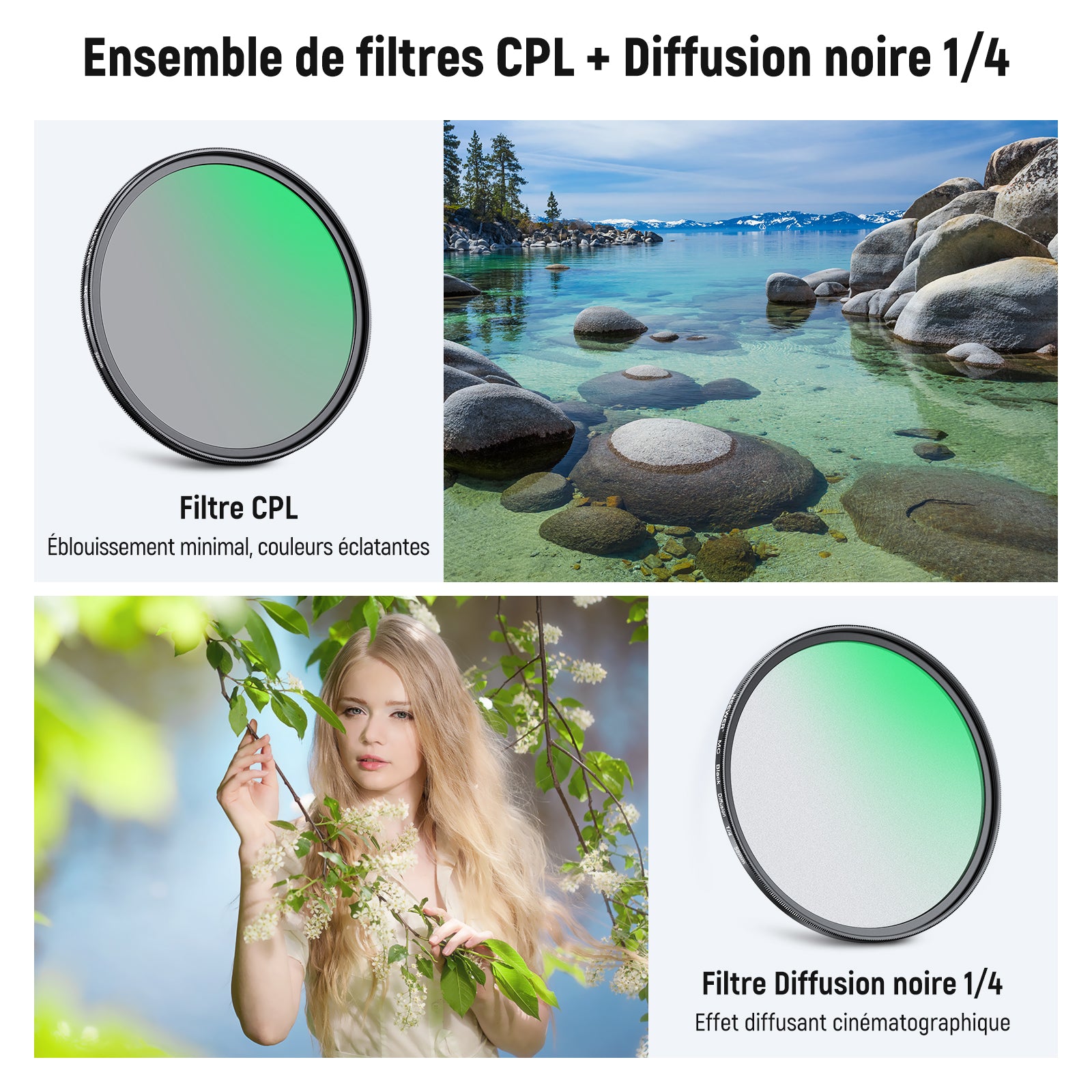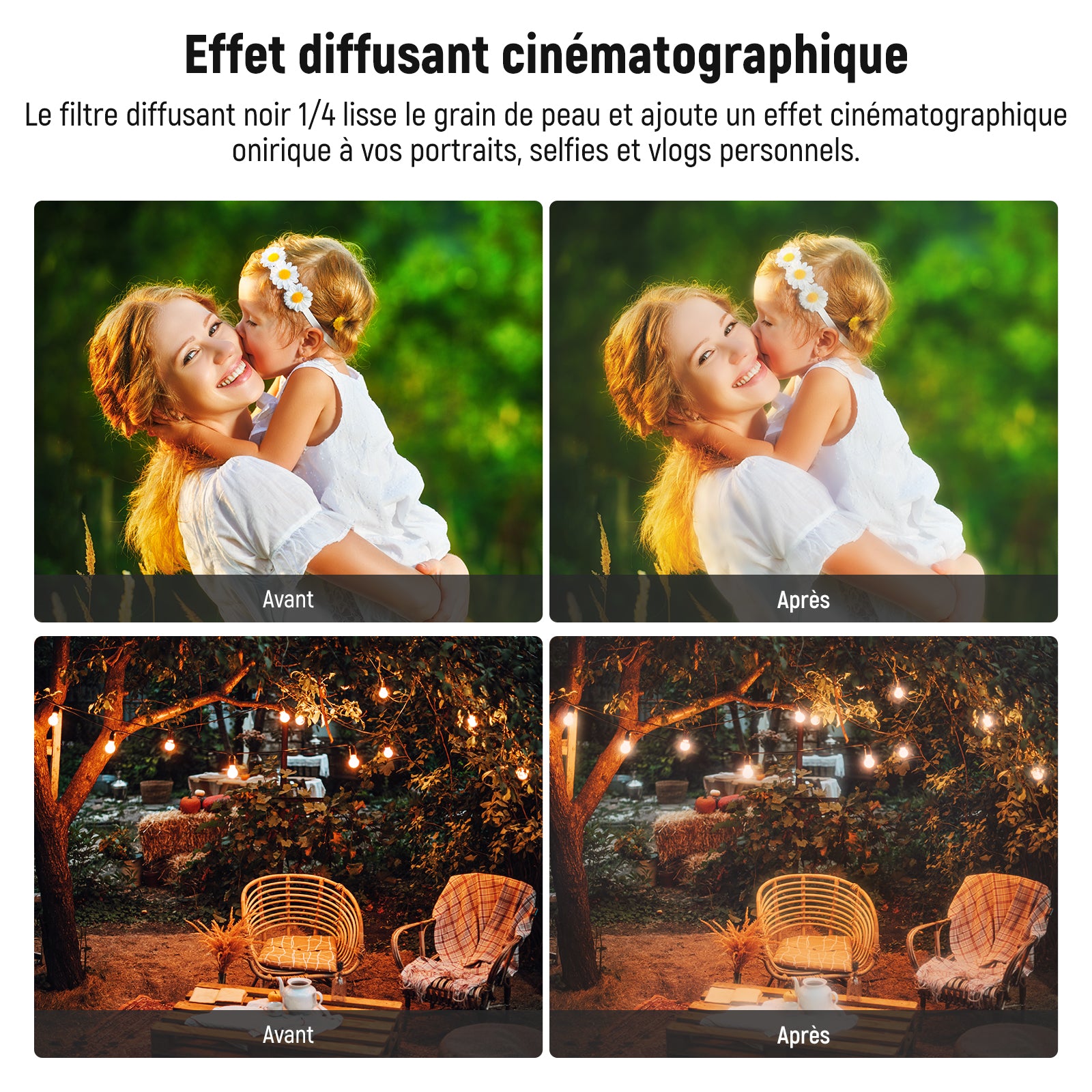 - 【Effet diffusif cinématographique】Le filtre de diffusion noir 1/4 lisse la texture de la peau et ajoute un effet cinématographique de rêve à votre photographie de portrait, selfies et vlogs personnels