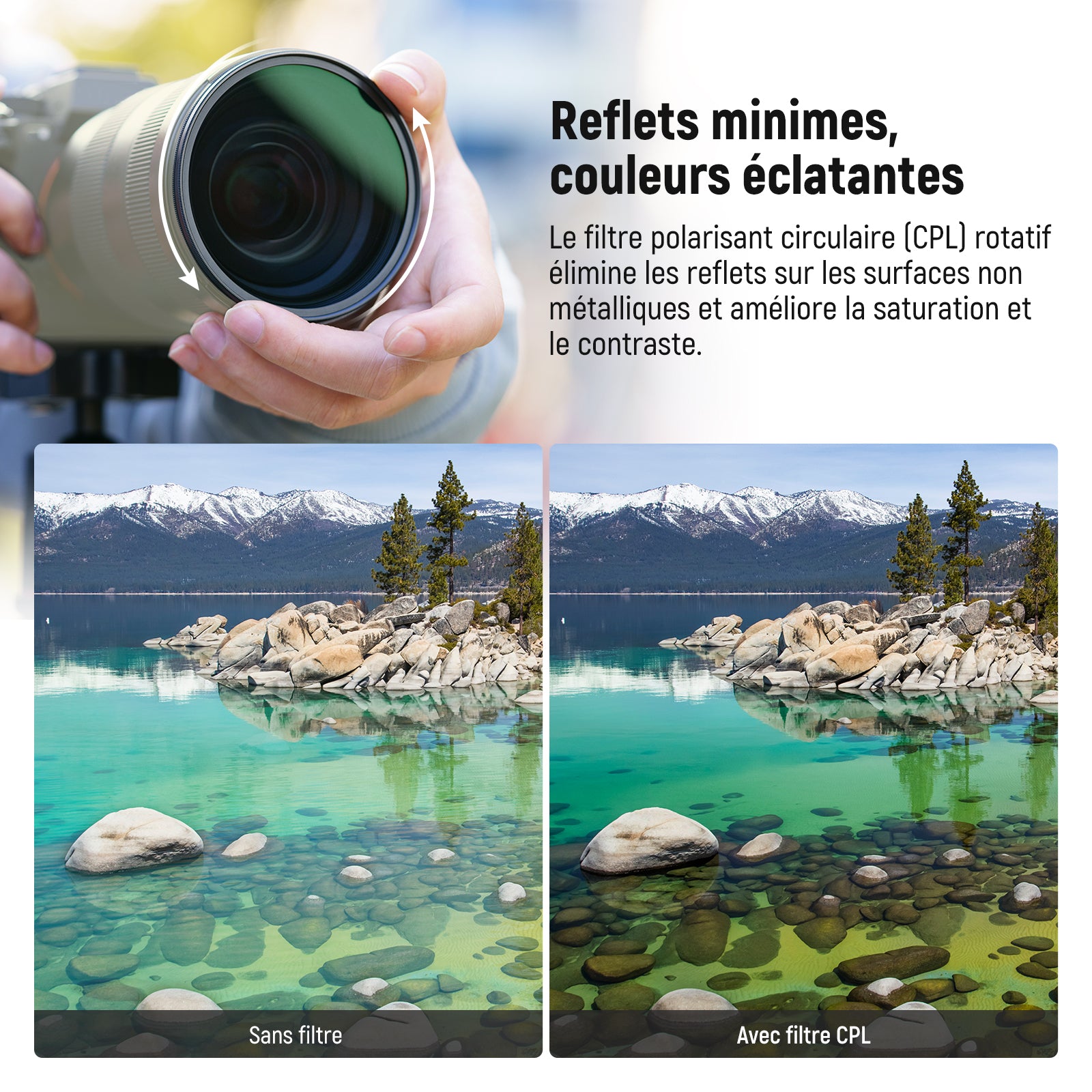 - 【Éblouissement minimal, couleurs vibrantes】 Le filtre CPL (polariseur circulaire) de 82 mm élimine les reflets et l'éblouissement du verre, de l'eau et d'autres surfaces non métalliques tout en améliorant la saturation et le contraste