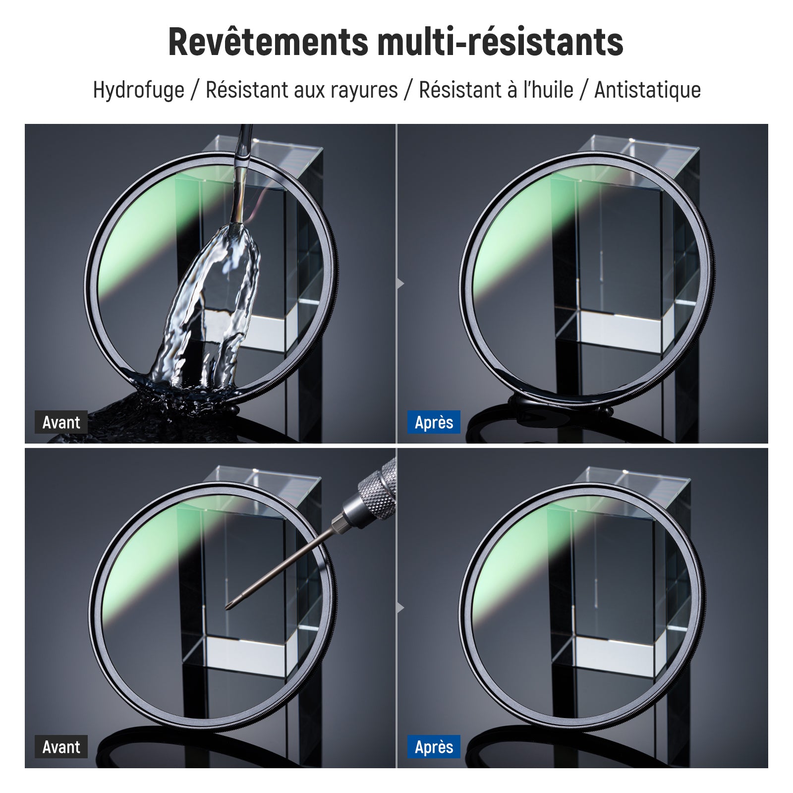 - Plusieurs revêtements de protection : plusieurs revêtements de protection sur les deux côtés du verre optique protègent le filtre de l'eau, de l'huile, de la poussière et des rayures. Des chiffons de nettoyage sont inclus pour l'entretien quotidien. Idéal comme accessoire de photographie essentiel pour les créateurs de contenu