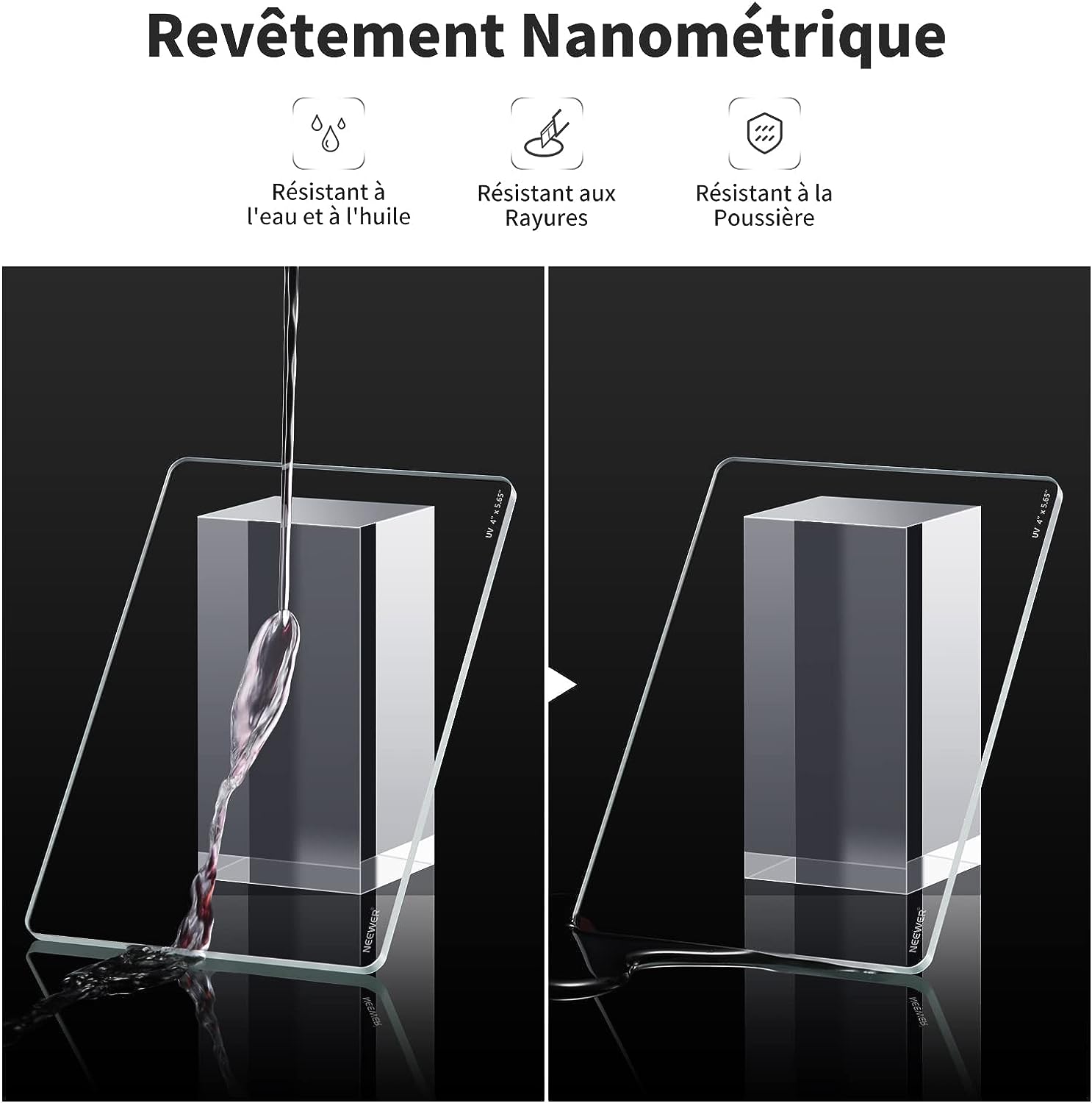 • 【Nano revêtement double face】 Doté de 30 couches de revêtements optiques et d'une transmission de la lumière allant jusqu'à 99,8 % (et d'une réflexion minimale de la lumière inférieure à 0,1 %), le filtre UV multicouche bloque les rayons ultraviolets allant de 300 nm à 410 nm pour réduire les reflets et les images fantômes tout en garantissant un rendu précis des couleurs. Les revêtements sont également antistatiques, résistants à l'huile, hydrofuges et résistants aux rayures