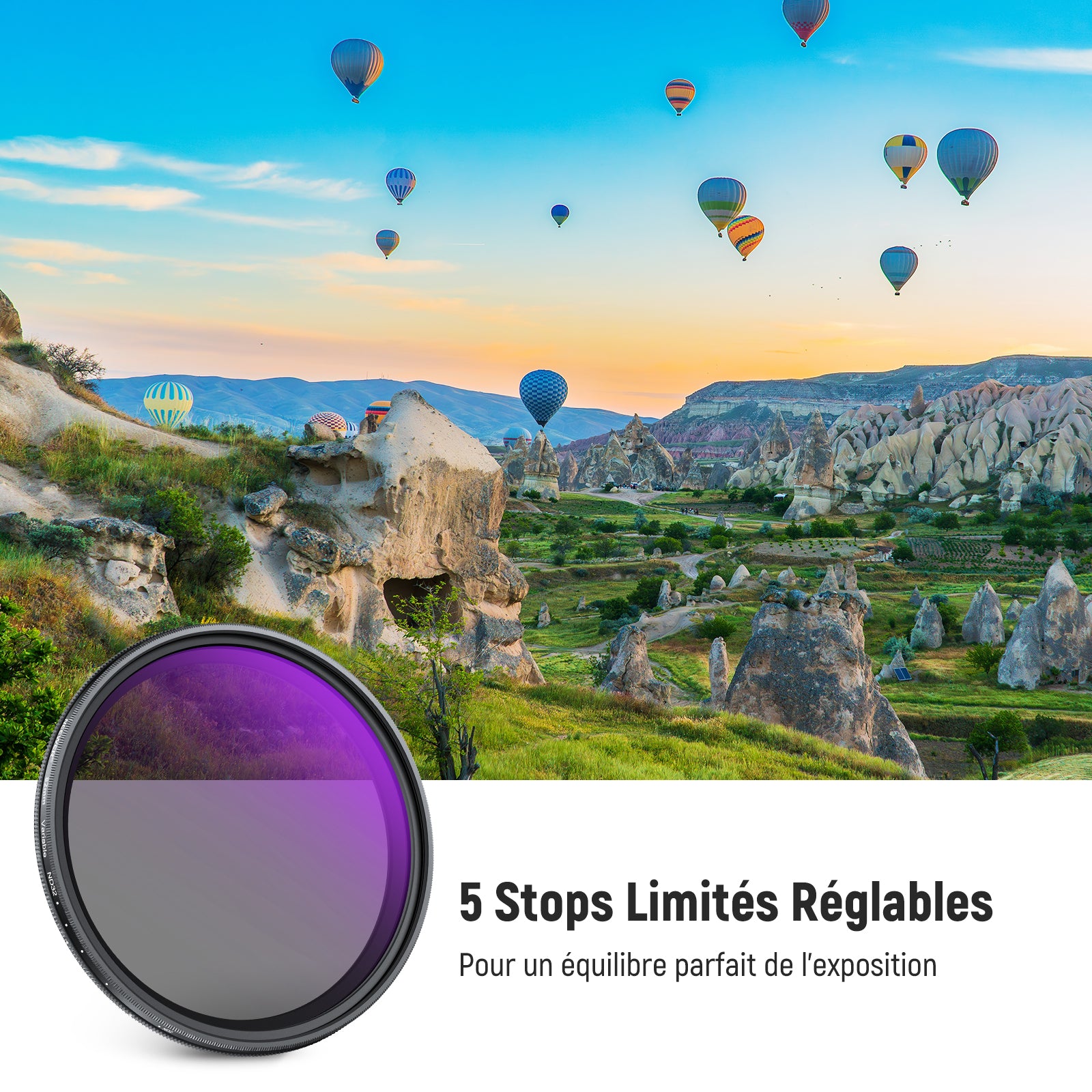 - 【Filtre ND variable de 82mm】 Ce filtre à densité neutre variable ND2-32 réduit la lumière qui pénètre dans l'appareil photo et vous permet de prendre des photos avec des vitesses d'obturation plus lentes et des ouvertures plus larges dans différentes conditions d'éclairage, parfait pour capturer des rivières, des cascades, des traînées lumineuses et d'autres sujets en mouvement avec un flou de mouvement dynamique