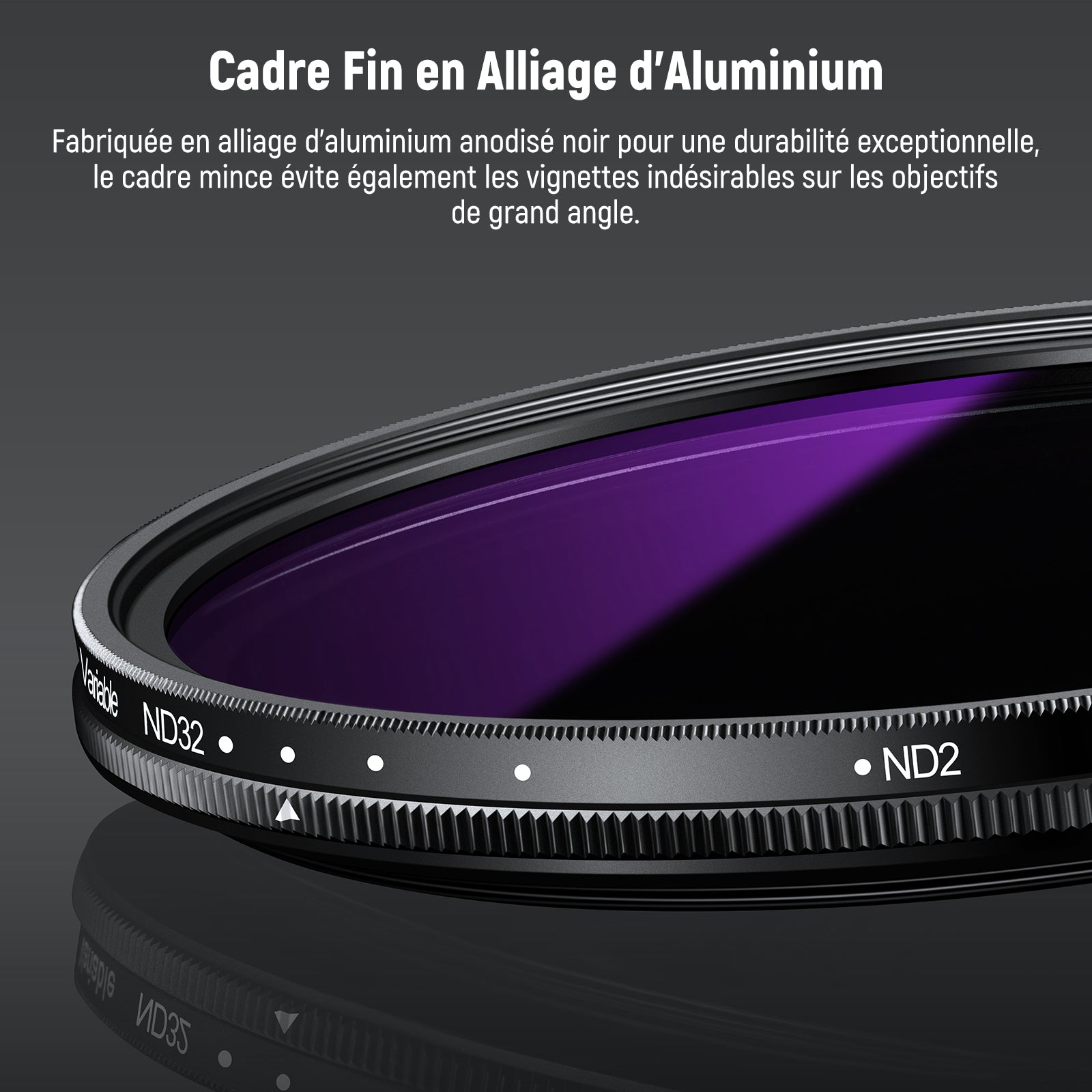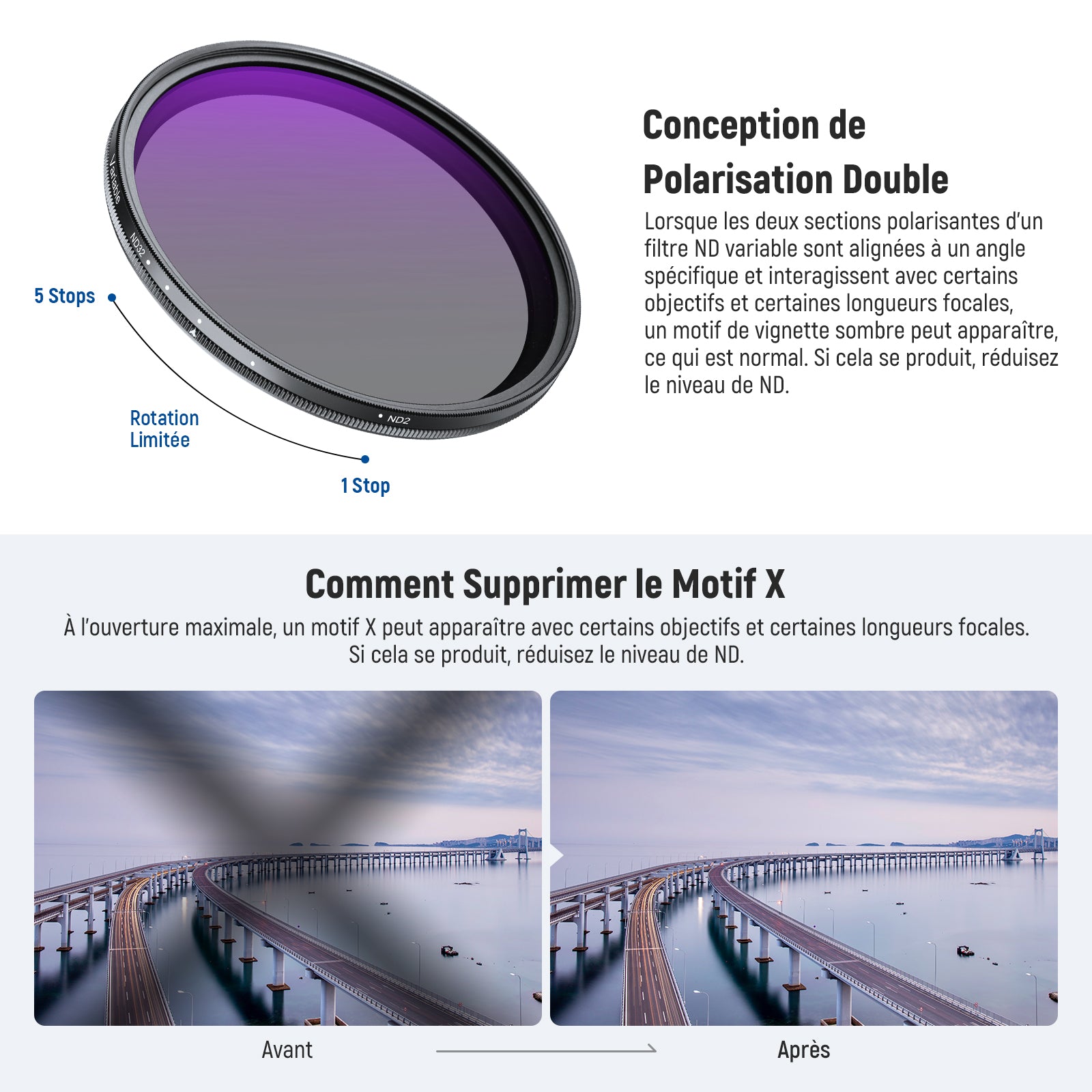- 【Réglage précis du ND】 Tournez la molette marquée pour obtenir des valeurs ND précises de ND2 à ND32 (1 à 5 arrêts) pour un équilibre d'exposition optimal. Remarque : les filtres ND variables fonctionnent sur des principes de polarisation. À l'ouverture maximale, certains objectifs et certaines distances focales peuvent provoquer un motif X en raison de l'interaction du filtre