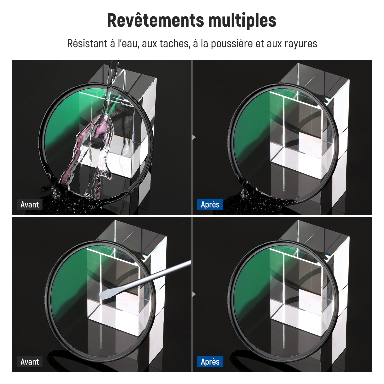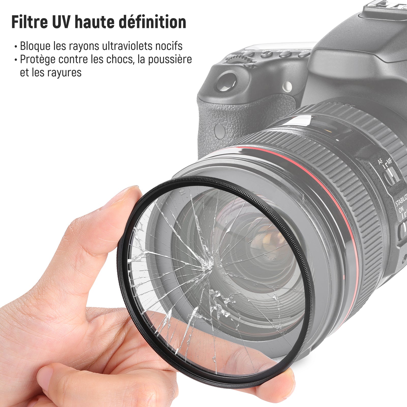 - 【Améliorez différemment vos photos】 vissez le filtre d'objectif droit.Filtre UV protège votre objectif de la poussière et des rayures.Filtre CPL élimine reflets sur les surfaces non métalliques,augmente contraste et la saturation et met en valeur les détails.Filtre à densité neutre réduit la lumière entrant dans votre appareil photo de 2 valeurs et vous permet de capturer des mouvements avec des flous de mouvement fluides tout en utilisant une vitesse d'obturation lente et de grandes ouvertures
