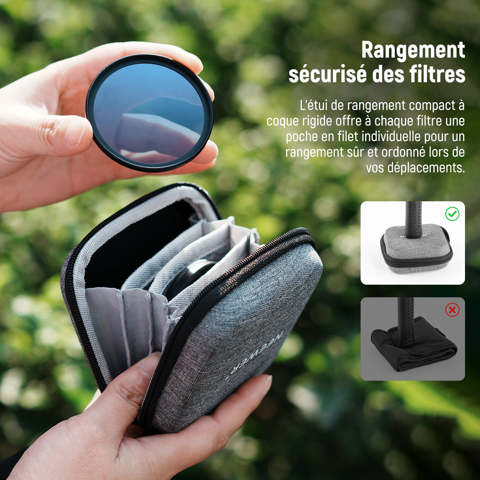 - 【Stockage sécurisé des filtres】L'étui de rangement compact à coque rigide offre à chaque filtre une poche en filet individuelle pour un rangement sûr et bien rangé lors de vos déplacements. Il est doté d'une fermeture éclair lisse pour une fermeture sécurisée et se glisse dans votre sac photo et votre sac à dos