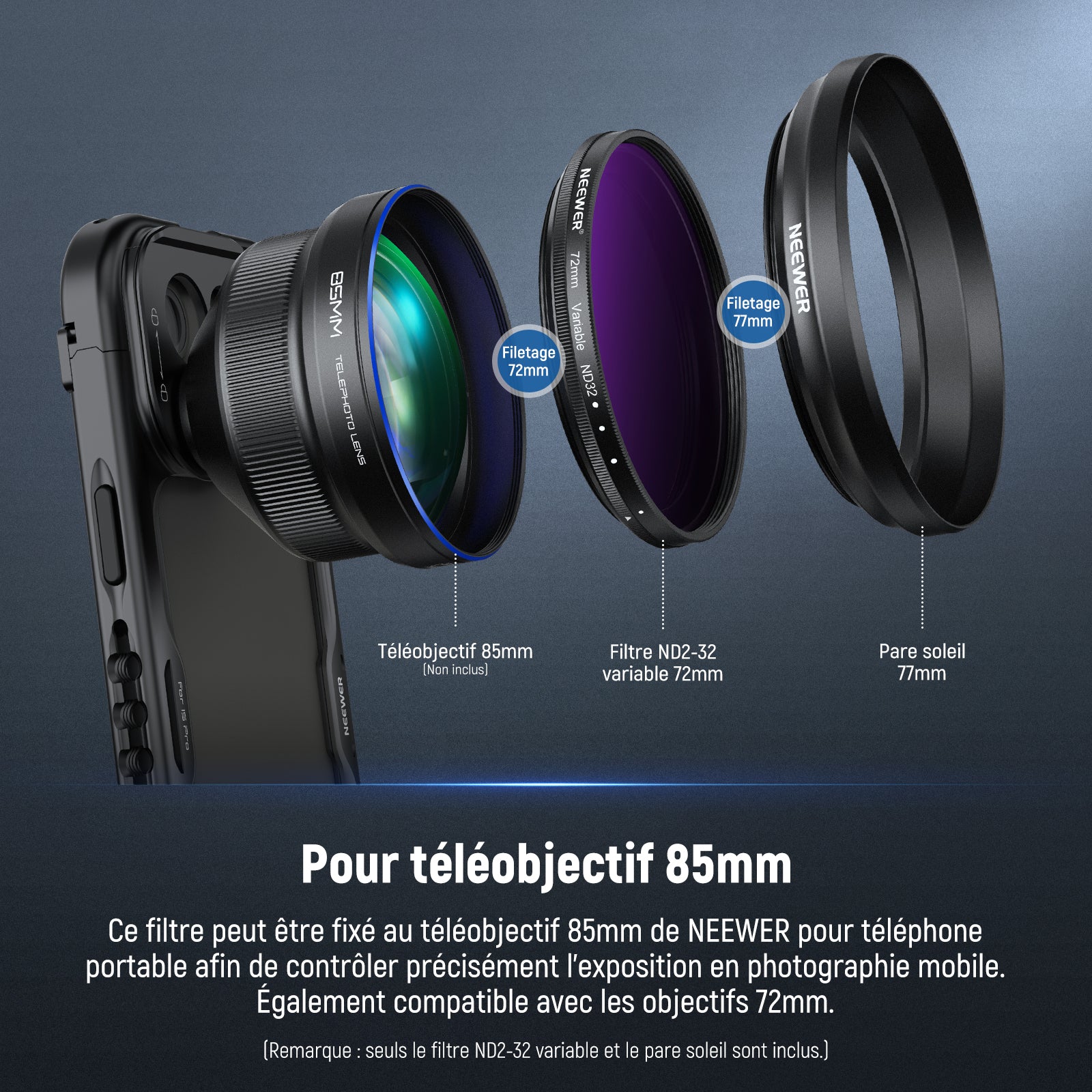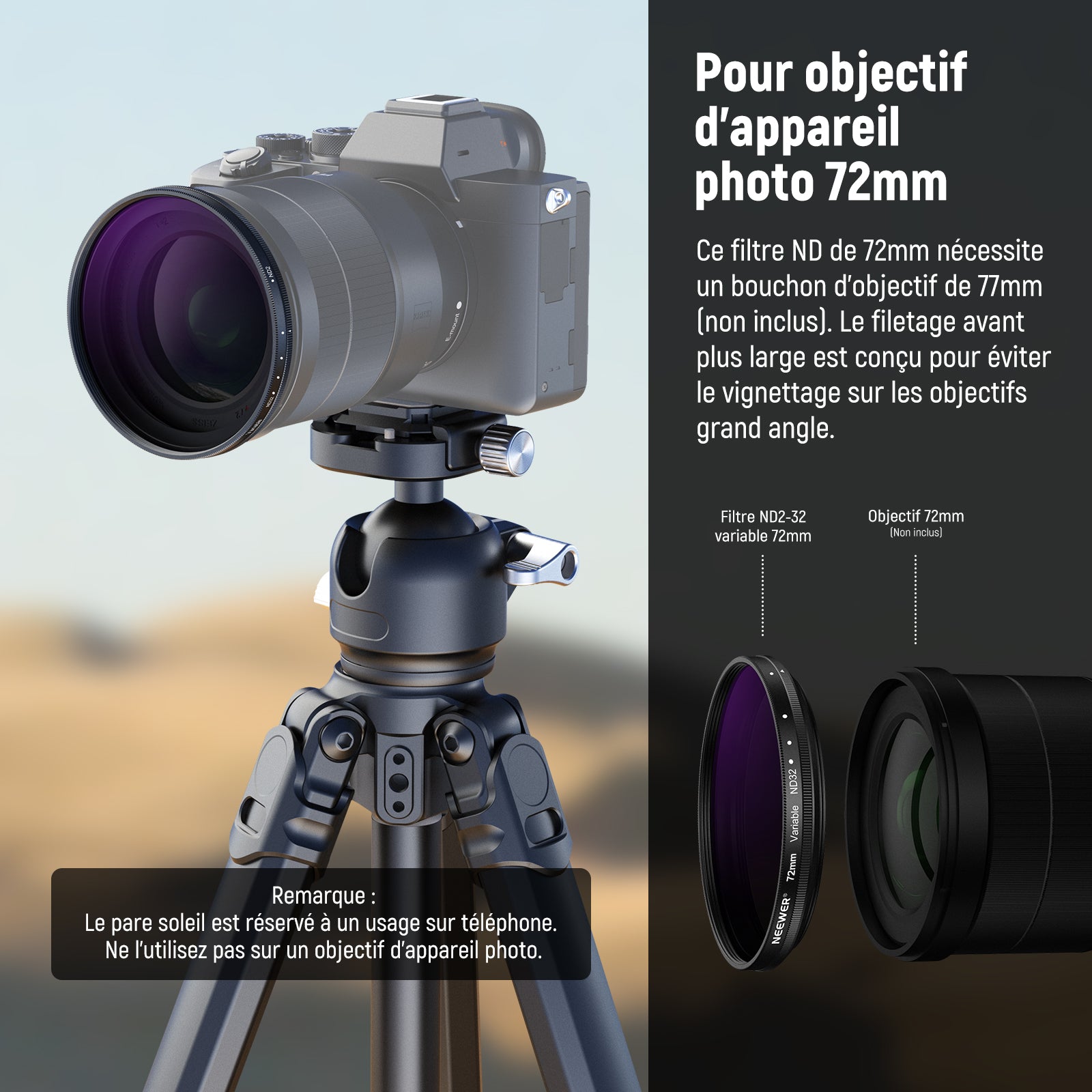 NEEWER 72mm Filtre ND Variable Pour Objectif Téléobjectif 85mm