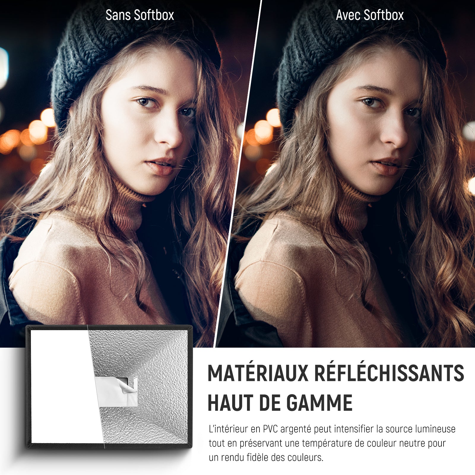 - 【Matériau de qualité supérieure】les extérieurs noirs des deux boîtes à lumière sont fabriqués en nylon durable pour une longue durée de vie, et l'intérieur en PVC argenté peut intensifier la source de lumière tout en préservant la température de couleur neutre pour un rendu fidèle des couleurs.