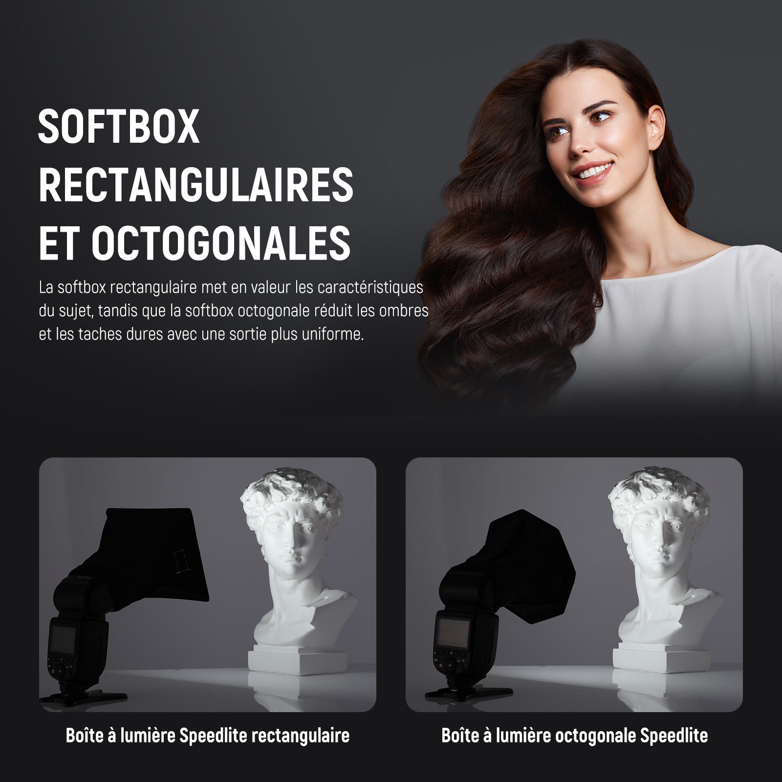 - 【Fixation par fermeture tactile 】fixez et détachez sans effort les softbox à l'aide de bandes élastiques et de fermetures tactiles. Lorsqu'elles ne sont pas utilisées, pliez les softbox à plat et rangez-les dans la pochette incluse pour un rangement facile