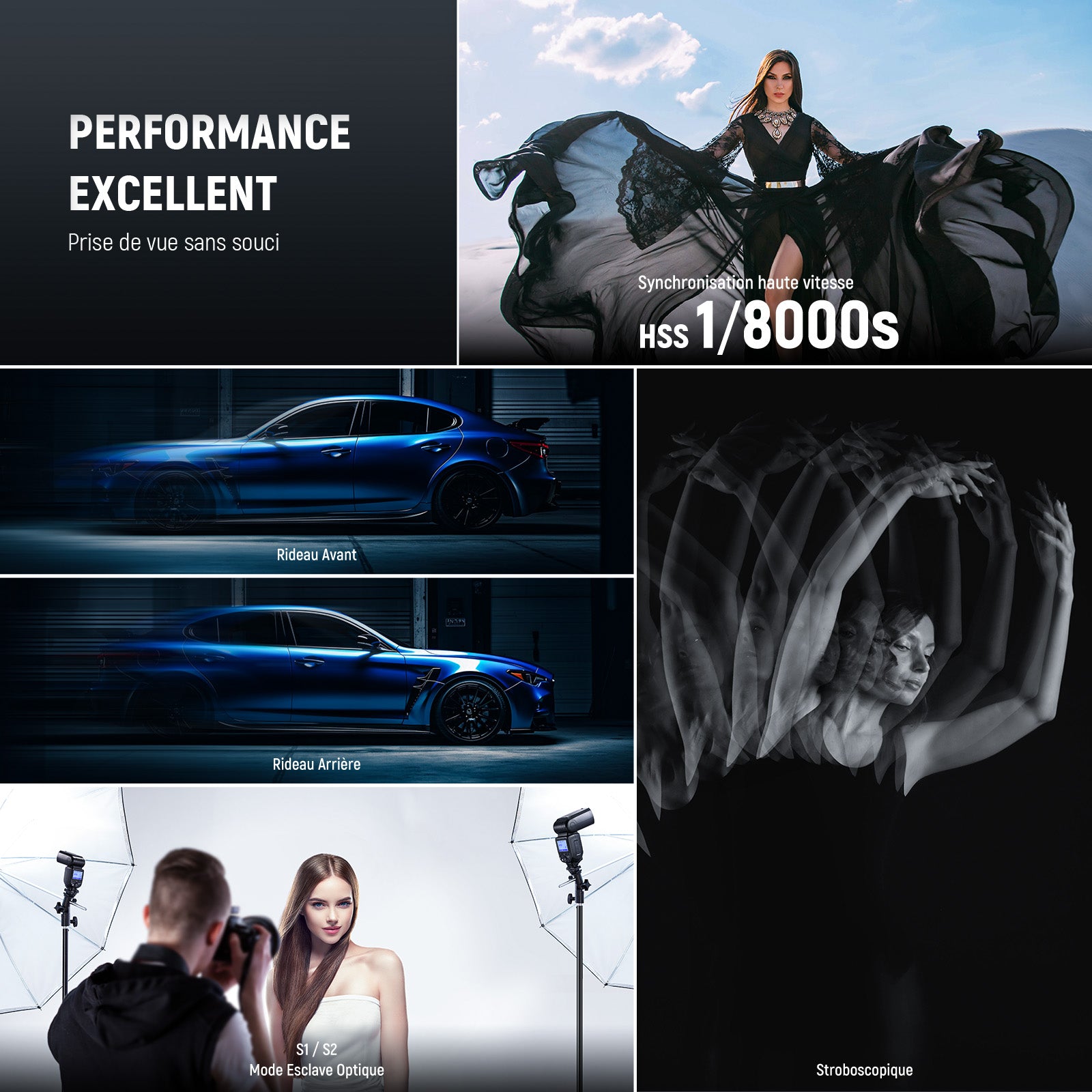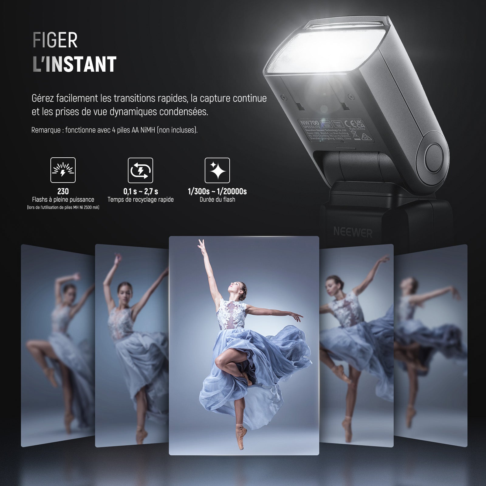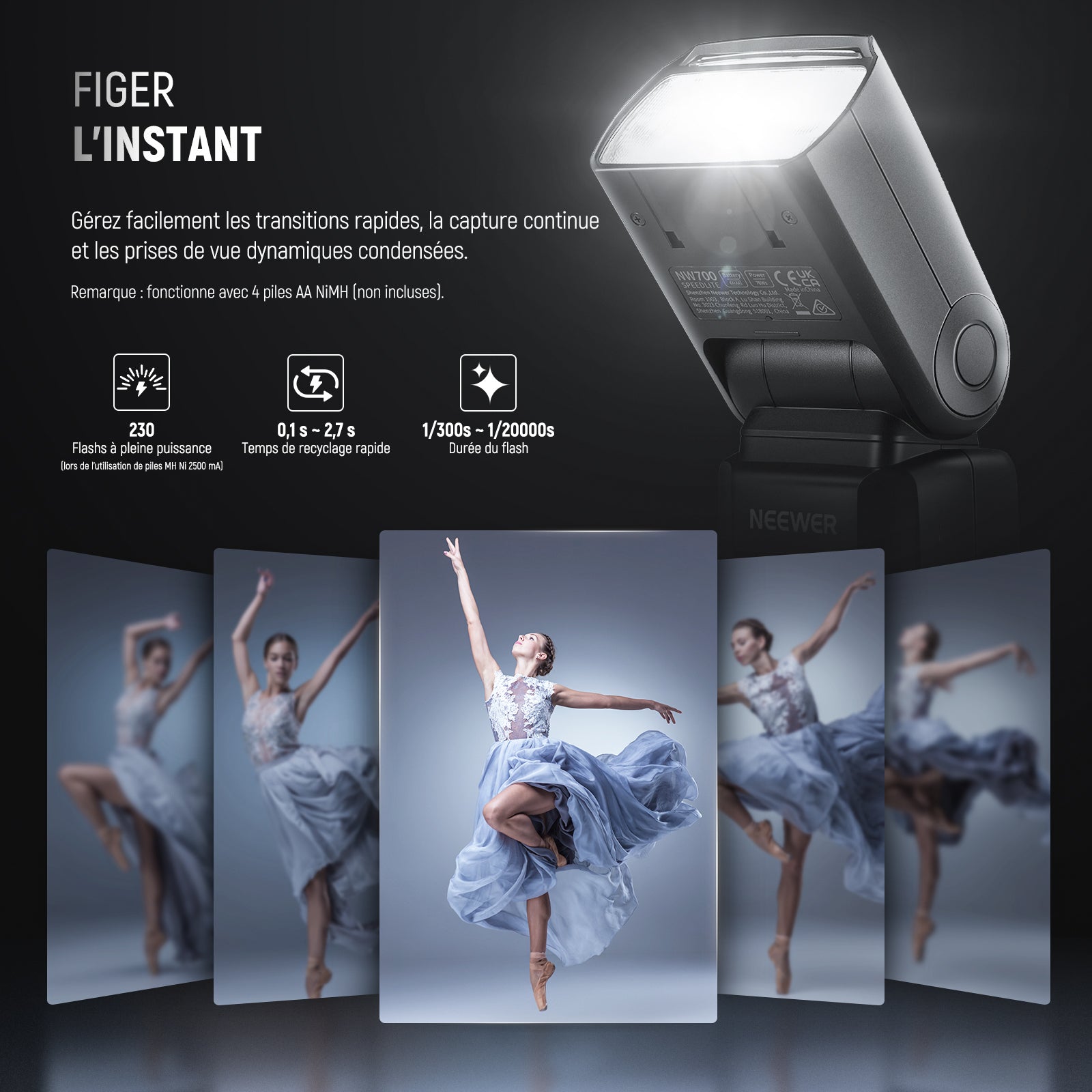 Haute performance avec double alimentation - Avec un port d'alimentation supplémentaire, le NW700-N peut être alimenté non seulement par 4 piles AA MH-Ni, mais aussi par l'alimentation externe CP-E4 (les deux non incluses). Prend en charge 230 flashs à pleine puissance, environ 0,1 à 2,7 secondes de recyclage rapide, et une durée de flash de 1/20000s (lors de l'utilisation de piles MH-Ni 2500mA), de sorte que les photographes ne manquent aucune prise de vue. Peut être contrôlé à distance par le déclencheur NEEWER FC-16 (non inclus).