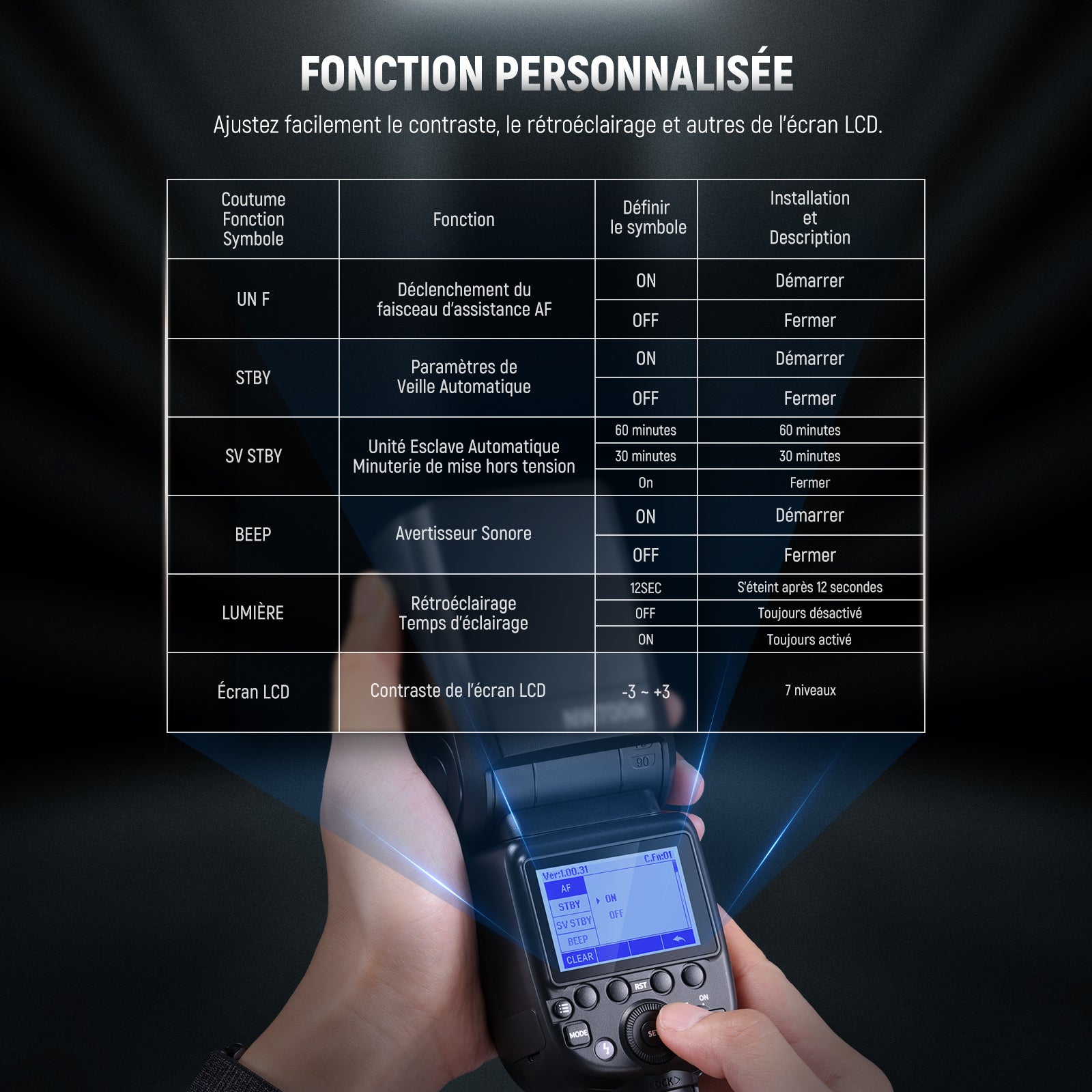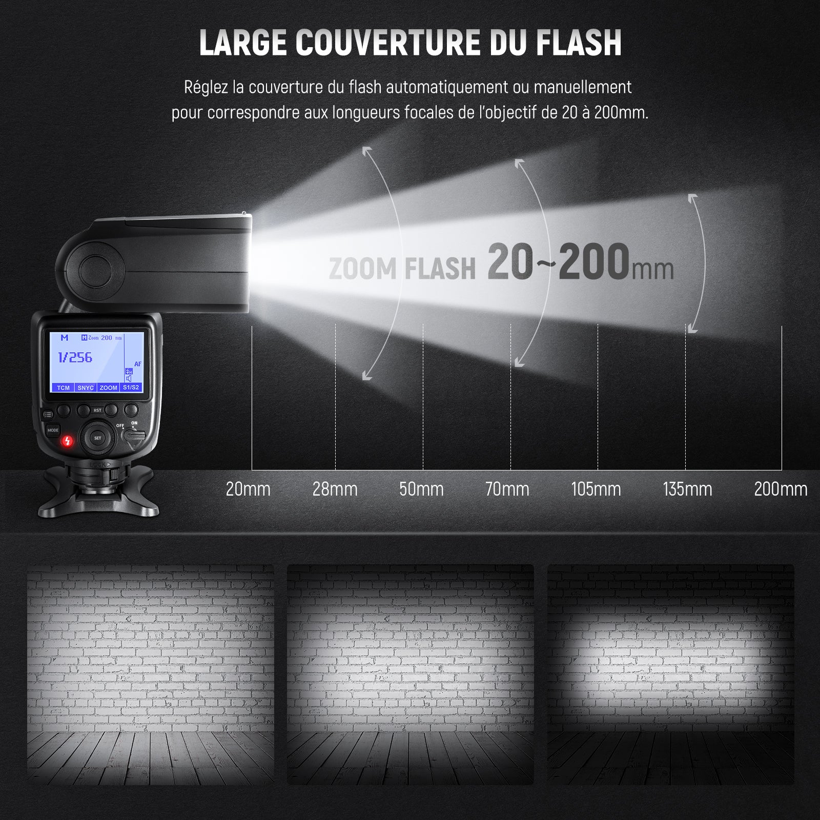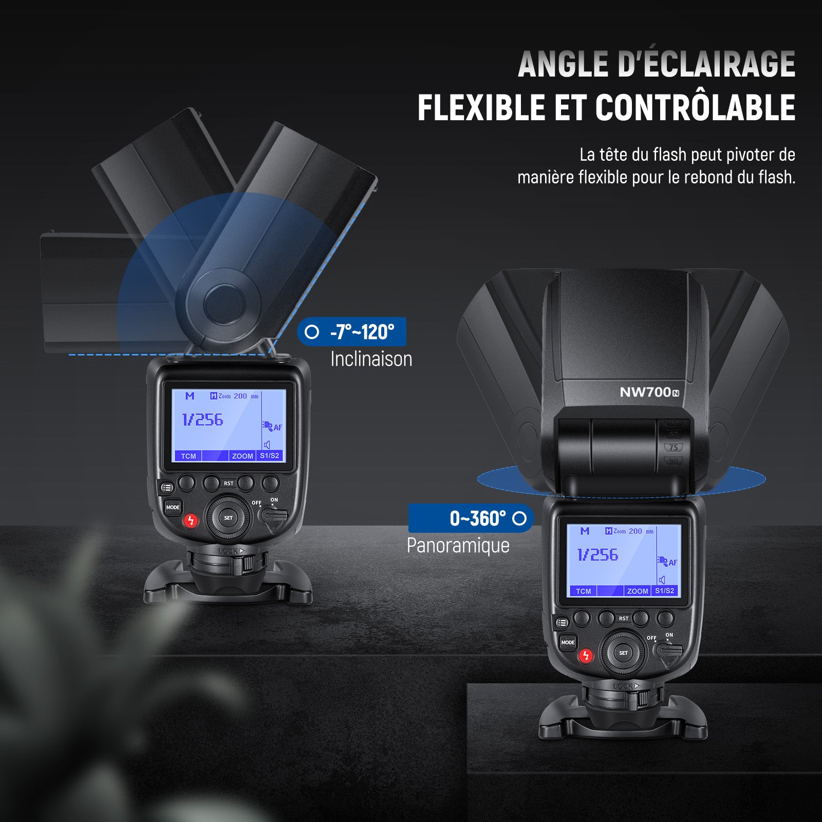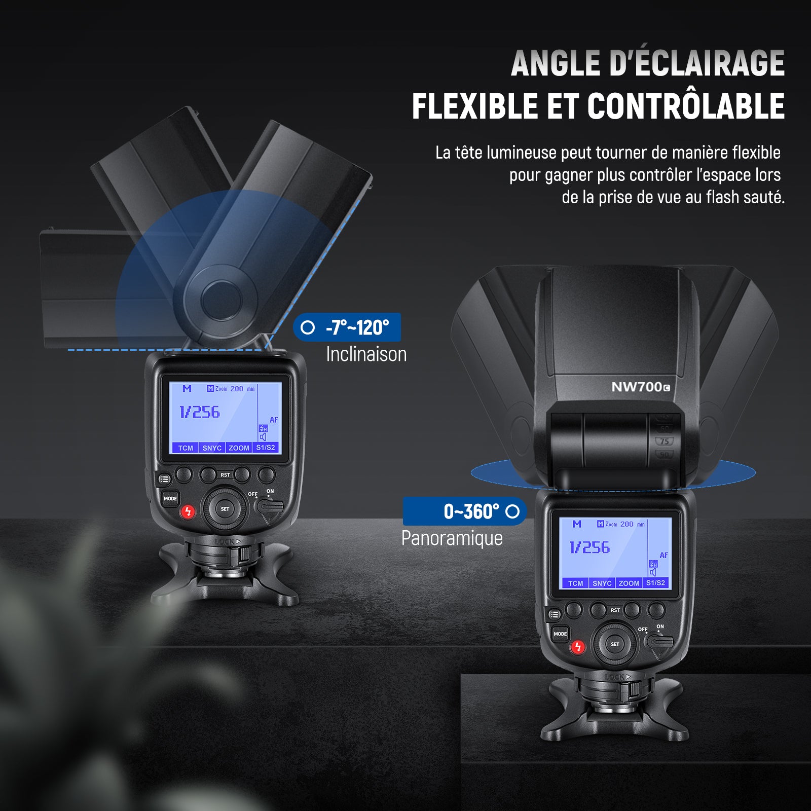 Polyvalent et multifonctionnel - Zoom automatique et manuel pris en charge, la couverture du flash va de 20 mm à 200 mm. Son flash est capable de s'incliner de -7° à 120° et de pivoter de 0 à 360° pour réaliser facilement un éclairage indirect, une photographie à courte distance, et bien plus encore. Le diffuseur grand angle inclus et le panneau de lumière réfléchissante aident à adoucir l'éclairage et à réfléchir la lumière dans les yeux du sujet. Le NW700-N comprend également un écran LCD, un port USB de type C pour la mise à niveau du micrologiciel, et d'autres fonctions personnalisées comme la mise hors tension automatique.