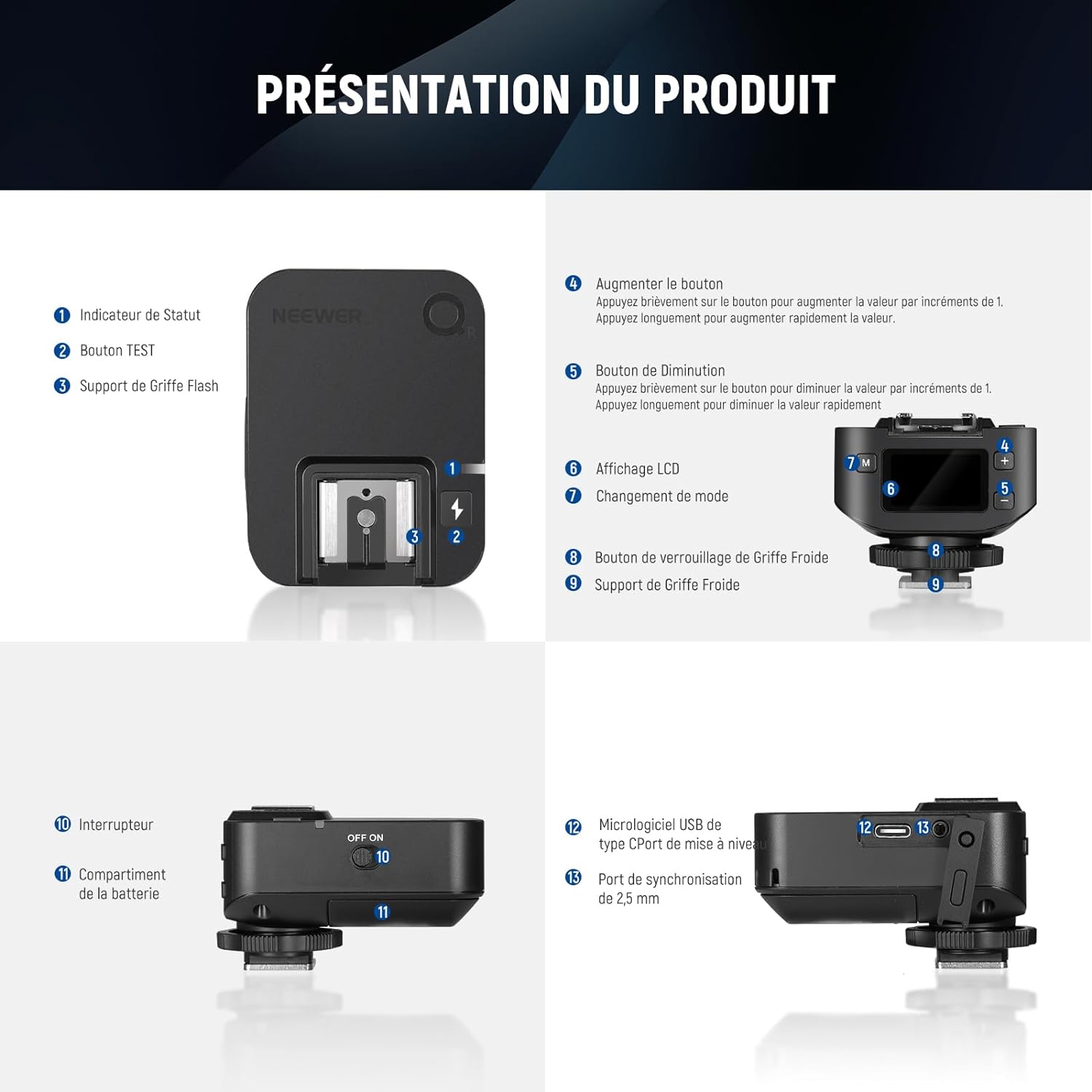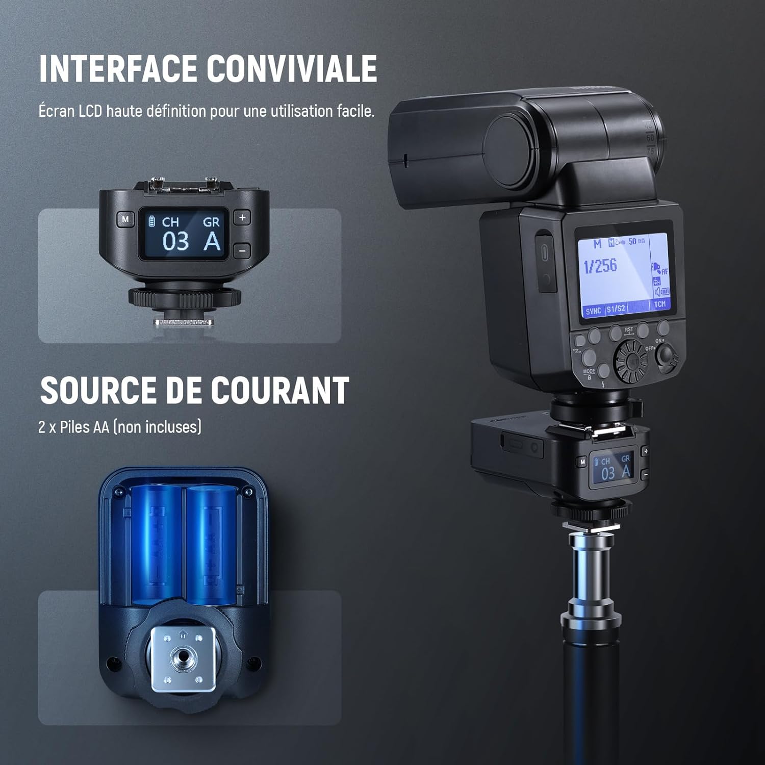 • 【Écran LCD et Bouton TEST】 Un écran LCD clair et haute définition avec des boutons physiques pour une utilisation intuitive. Alimenté par 2 piles AA (non incluses) et prend en charge les mises à niveau du micrologiciel via un câble USB de type C (non inclus). Livré également avec un bouton de déclenchement TEST pour le tir de test flash