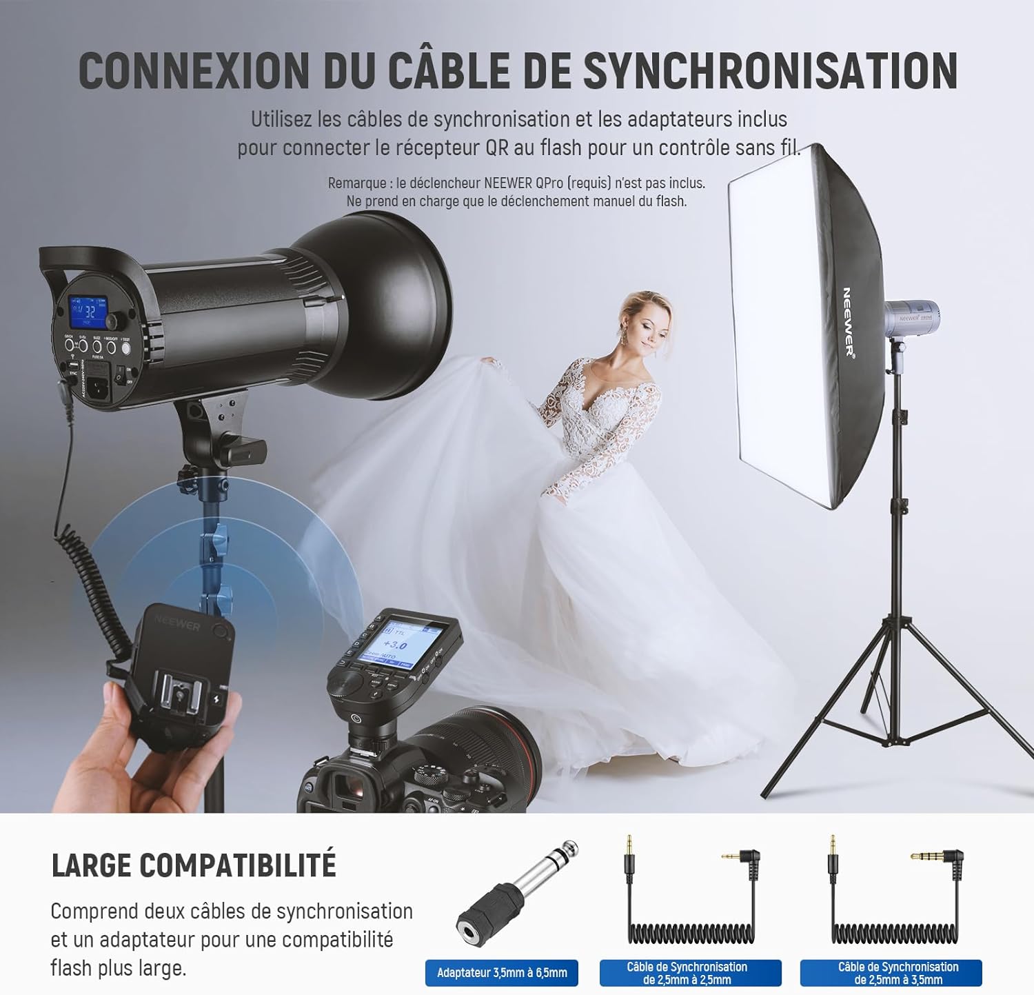 • 【Câbles de synchronisation inclus pour divers monolights】 Utilisez les câbles de synchronisation 2,5 mm/3,5 mm/6,5 mm inclus et l'adaptateur pour connecter des stroboscopes monolights qui ne sont pas fournis avec le système NEEWER 2.4G Q, tels que NEEWER VISION 4, S101-300W Pro, S101. -400W Pro, ML300, puis associez-les à un déclencheur QPRO pour un contrôle sans fil. Compatible avec Yongnuo Godox AD200Pro AD400Pro