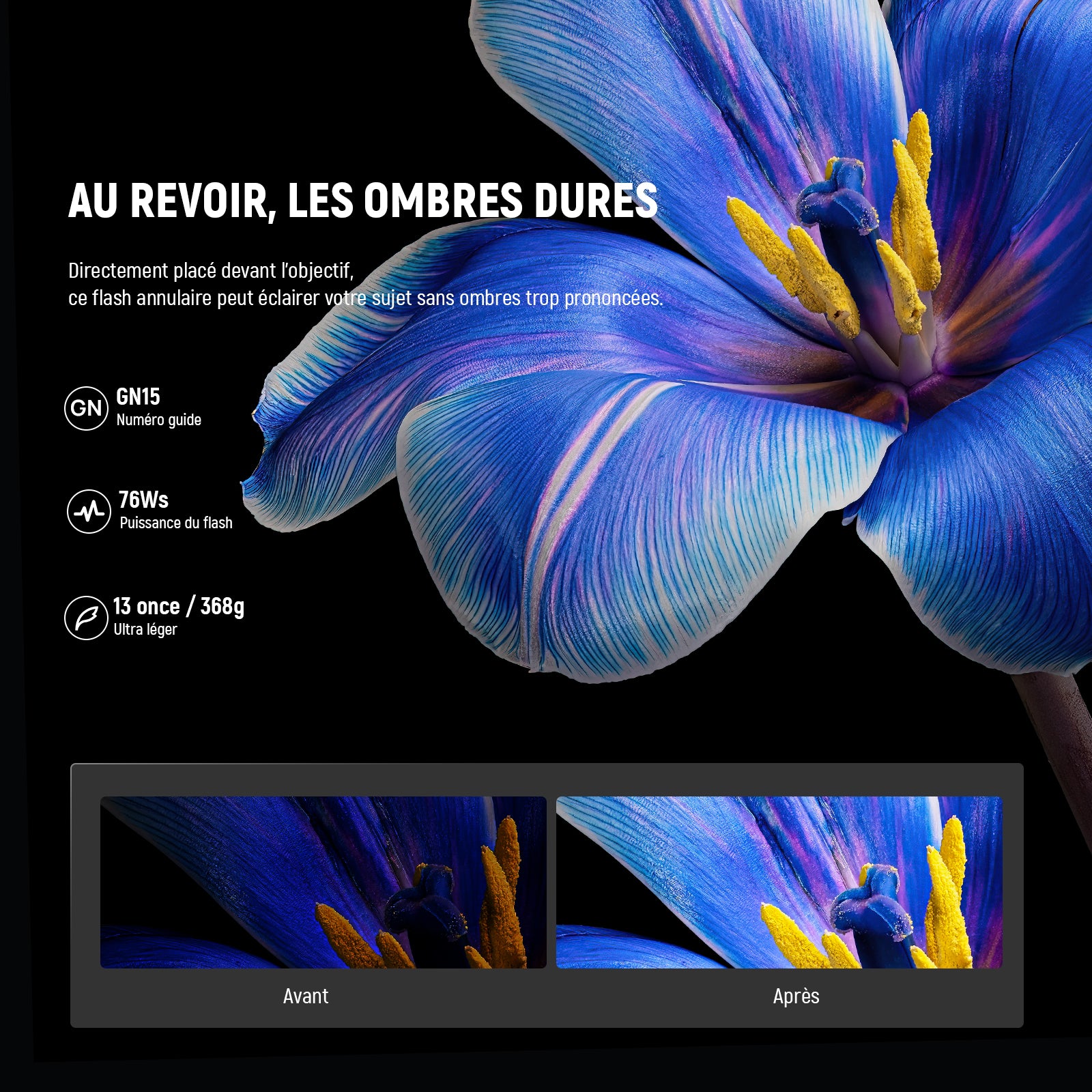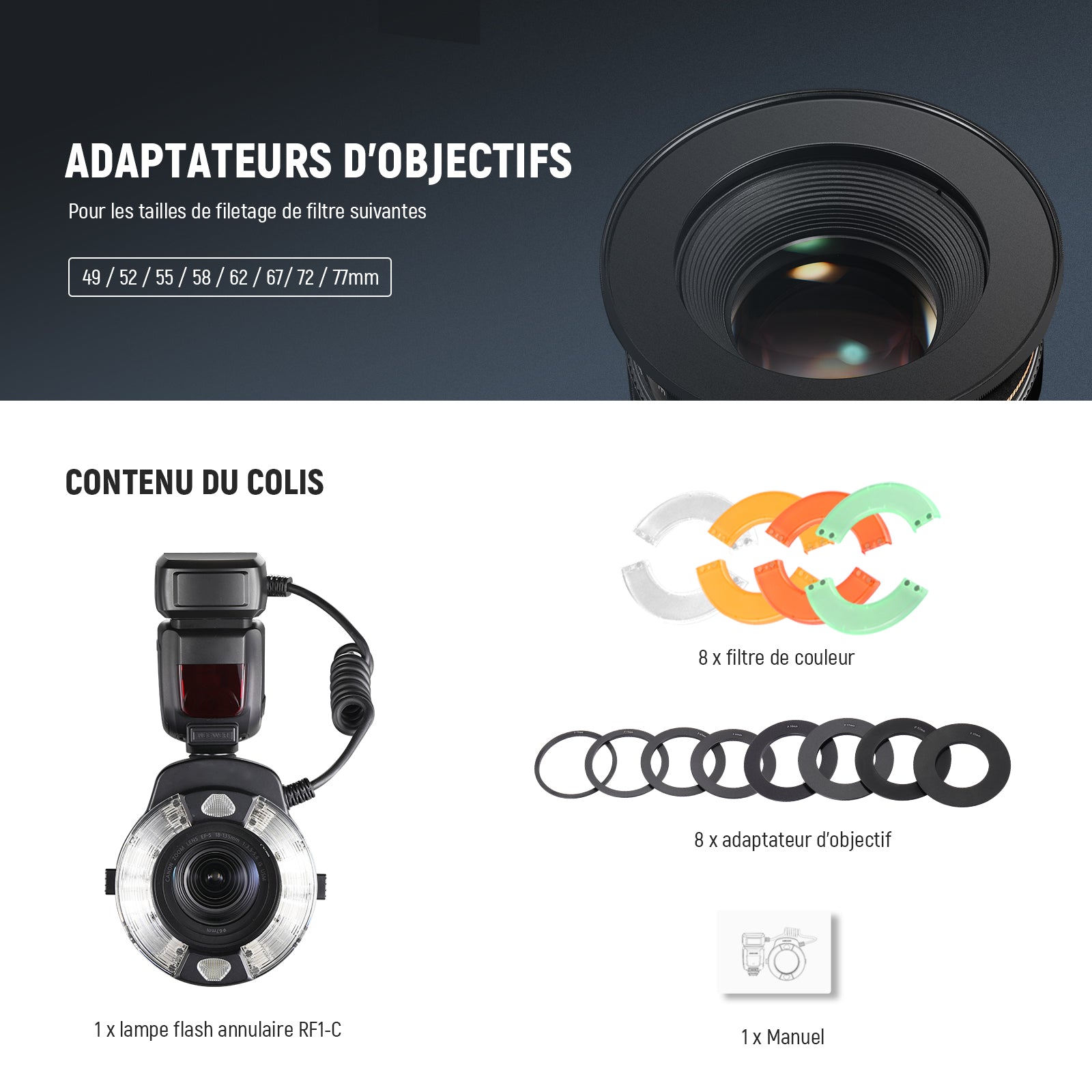 - 【Flash annulaire macro pour appareils photo Canon EOS】 RF1-C est un flash annulaire macro pour Canon, idéal pour les plantes, les insectes, les accessoires et autres sujets de macrophotographie. Une couverture de flash large de 80° sous tous les angles peut éclaircir uniformément les sujets, minimiser les ombres dures et éviter le vignettage. Pesant 13oz/368g, cet anneau flash compact et léger est applicable dans toutes les situations, larges ou étroites