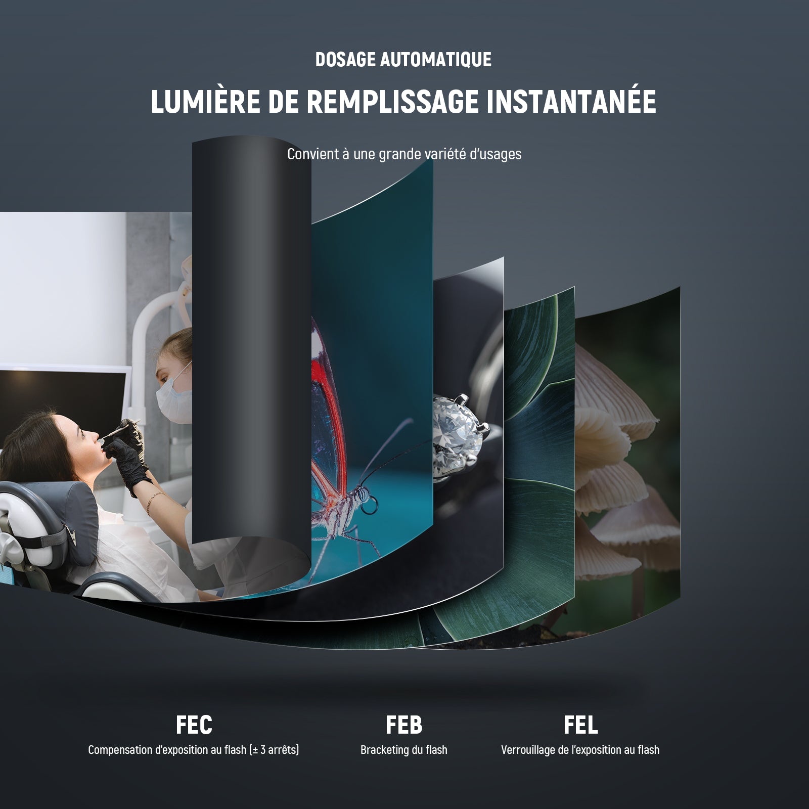 - 【3 modes flash et tubes flash indépendants】 Le mode TTL obtient automatiquement une exposition correcte ; Le mode M prend en charge la puissance du flash manuel réglable de 1/1 à 1/128 ; Le mode MULTI offre des flashs stroboscopiques créatifs. Les tubes flash A/B sont contrôlables indépendamment et collectivement. En modes TTL/M, le rapport de flash 8:1-1:1-1:8 est réglable par 1/2 valeurs pour un réglage précis du contraste de l'image
