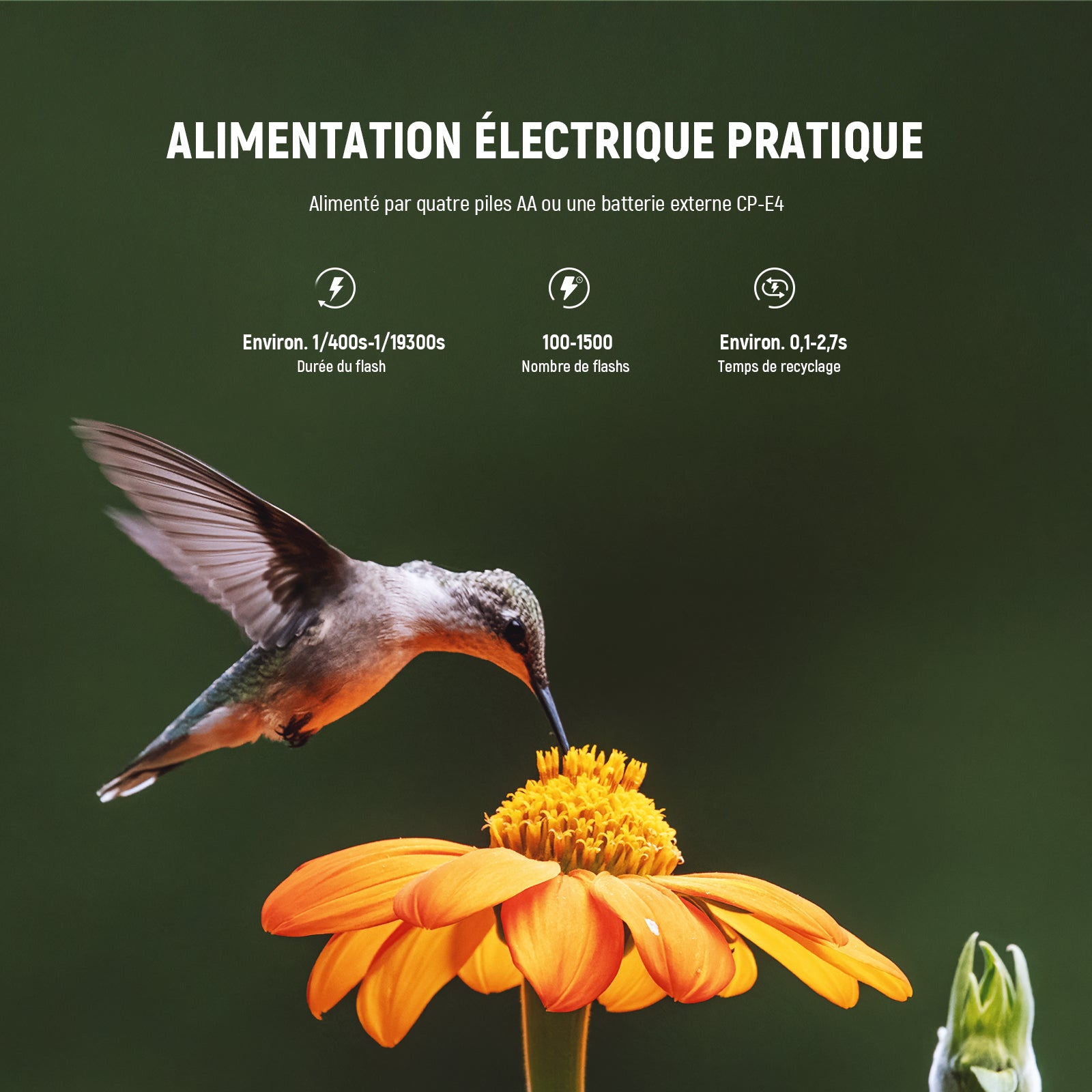 - 【Sortie Puissante avec Fonctions Avancées】 Ce flash macro offre une puissance de 76Ws, un nombre guide GN15 (ISO100, 1M), la compensation d’exposition, le bracketing d’exposition, le verrouillage du flash, la synchronisation sur le premier/second rideau, une prise PC sync et d'autres fonctionnalités. Alimenté par 4 piles AA, l’anneau flash propose une durée d’éclair de 1/400 à 1/19300s, un temps de recyclage de 0,1 à 2,7s et permet 100 à 1500 éclairs. Il peut également être connecté à une source d’alimentation externe via le port CP-E4 pour accélérer le recyclage. Nécessite des piles rechargeables ou alcalines à forte consommation de 1,5V pour l'alimentation électrique.