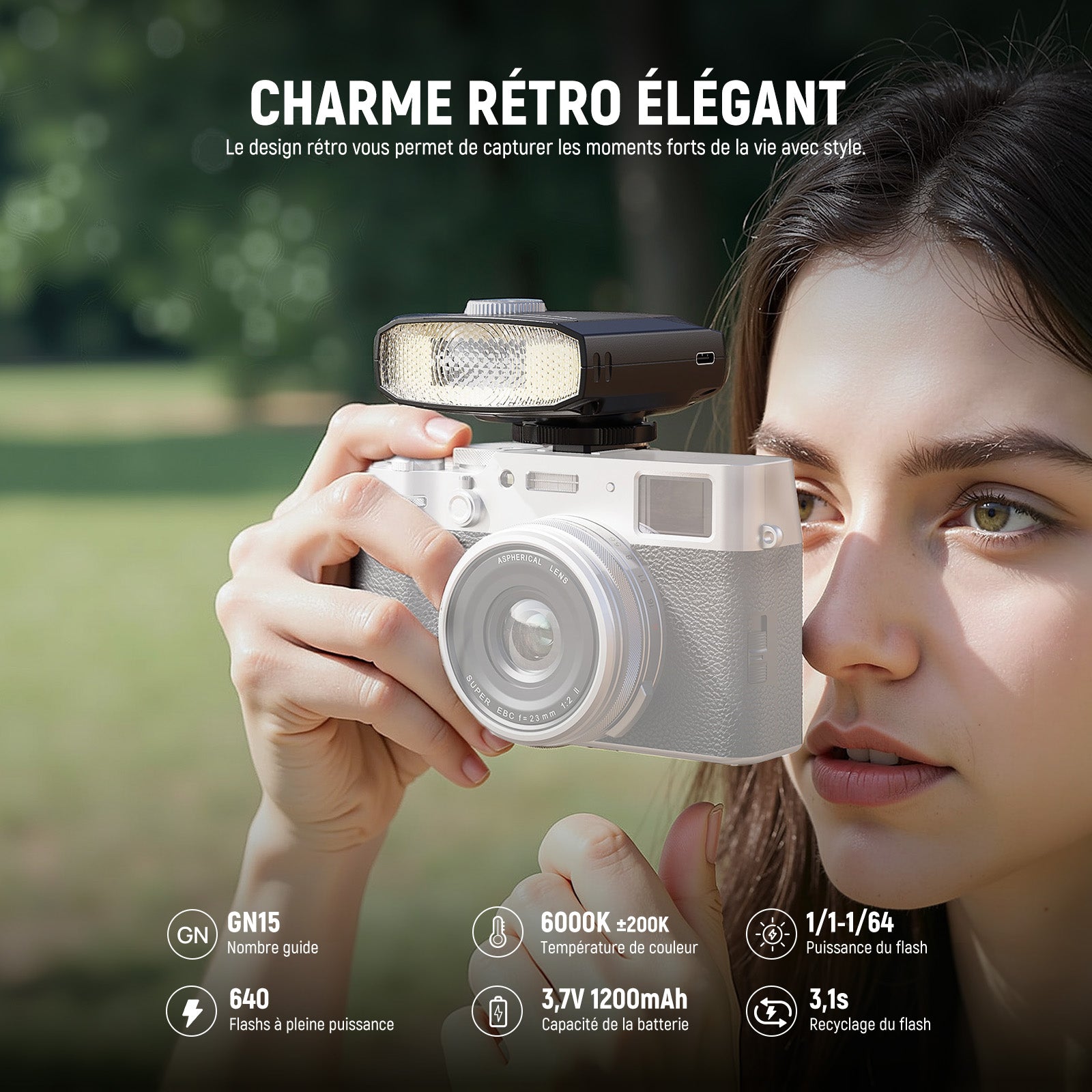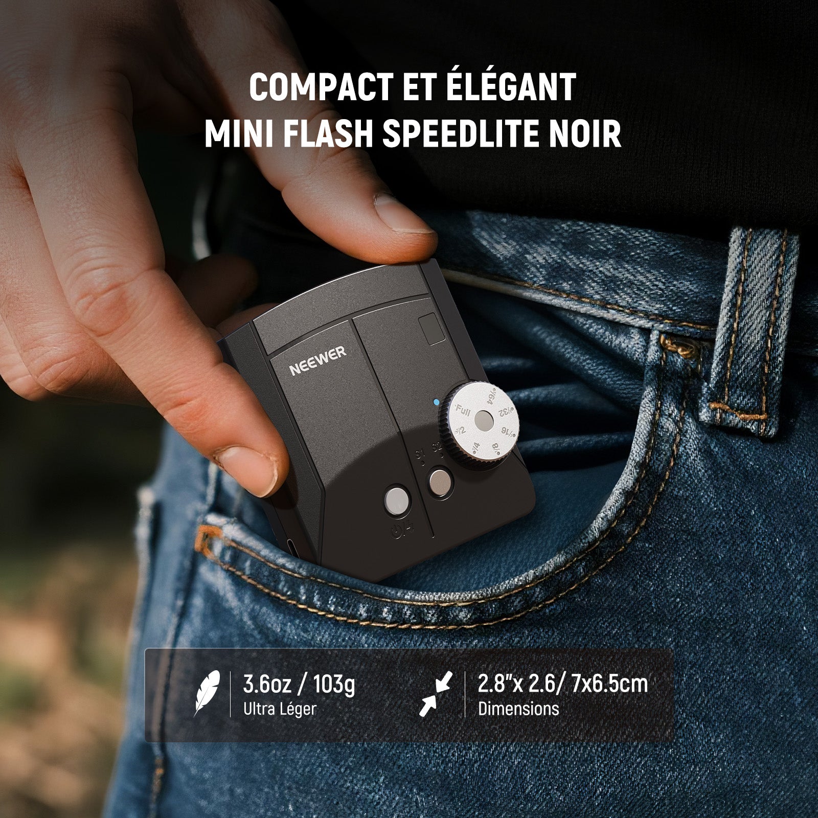 - 【Mini flash Speedlite noir compact et élégant】 Le NEEWER Z150 est un flash Speedlite léger (103g) au style rétro, au format de poche, plus portable qu'un flash de studio. Fixez-le facilement à votre appareil photo pour des photos de rue sans effort et sans fatigue. Son design compact et vintage s'intègre parfaitement à votre appareil, ce qui en fait un éclairage photo indispensable pour les créateurs de contenu et les influenceurs, indispensable pour leurs prises de vue en déplacement.