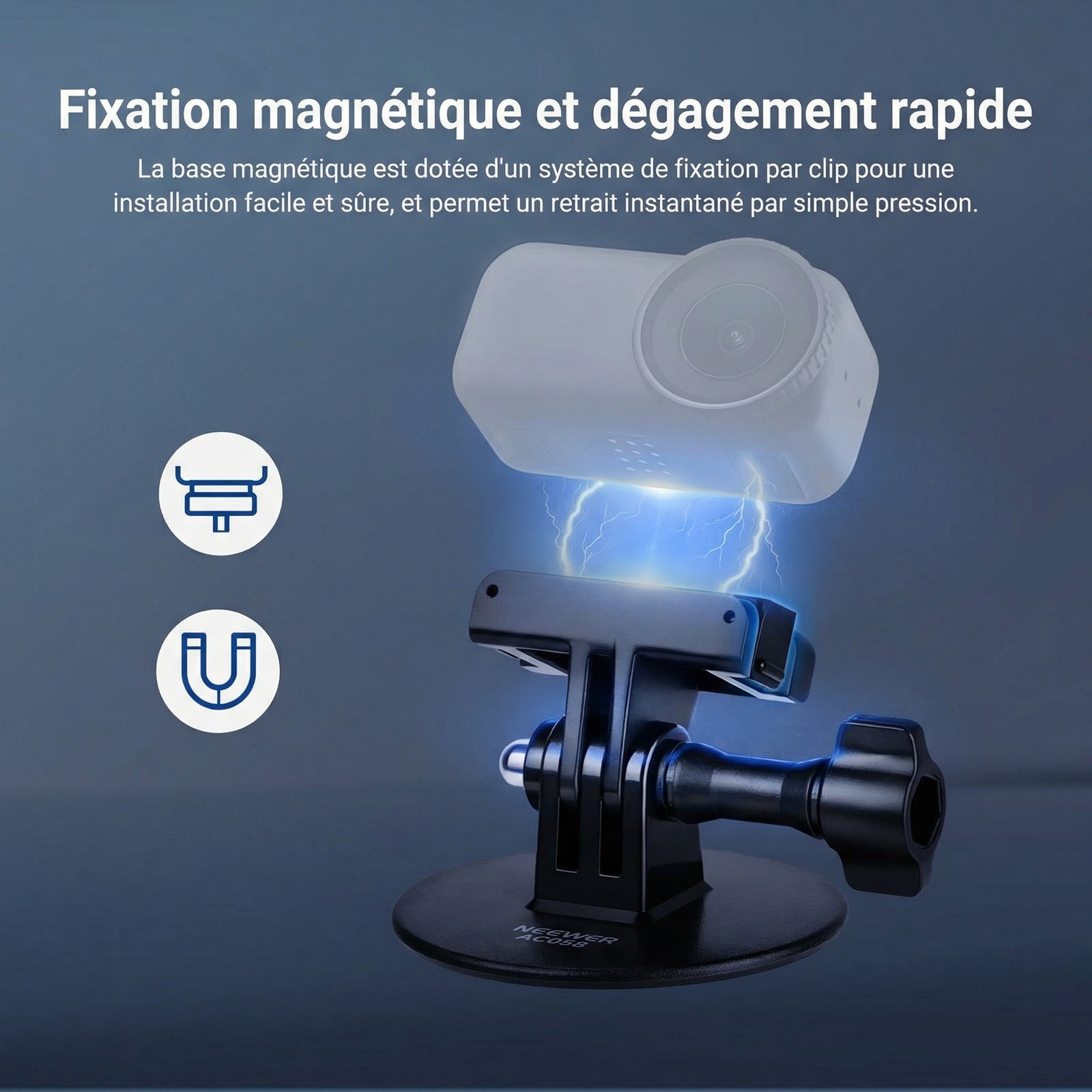 - 【Fixation magnétique et dégagement rapide】 Ce support pour caméra d'action, idéal pour l'enregistrement vidéo en vue subjective, est doté d'aimants et de clips de fixation qui maintiennent votre appareil en toute sécurité. Un simple appui suffit pour le libérer. Il constitue un accessoire de fixation idéal pour votre caméra