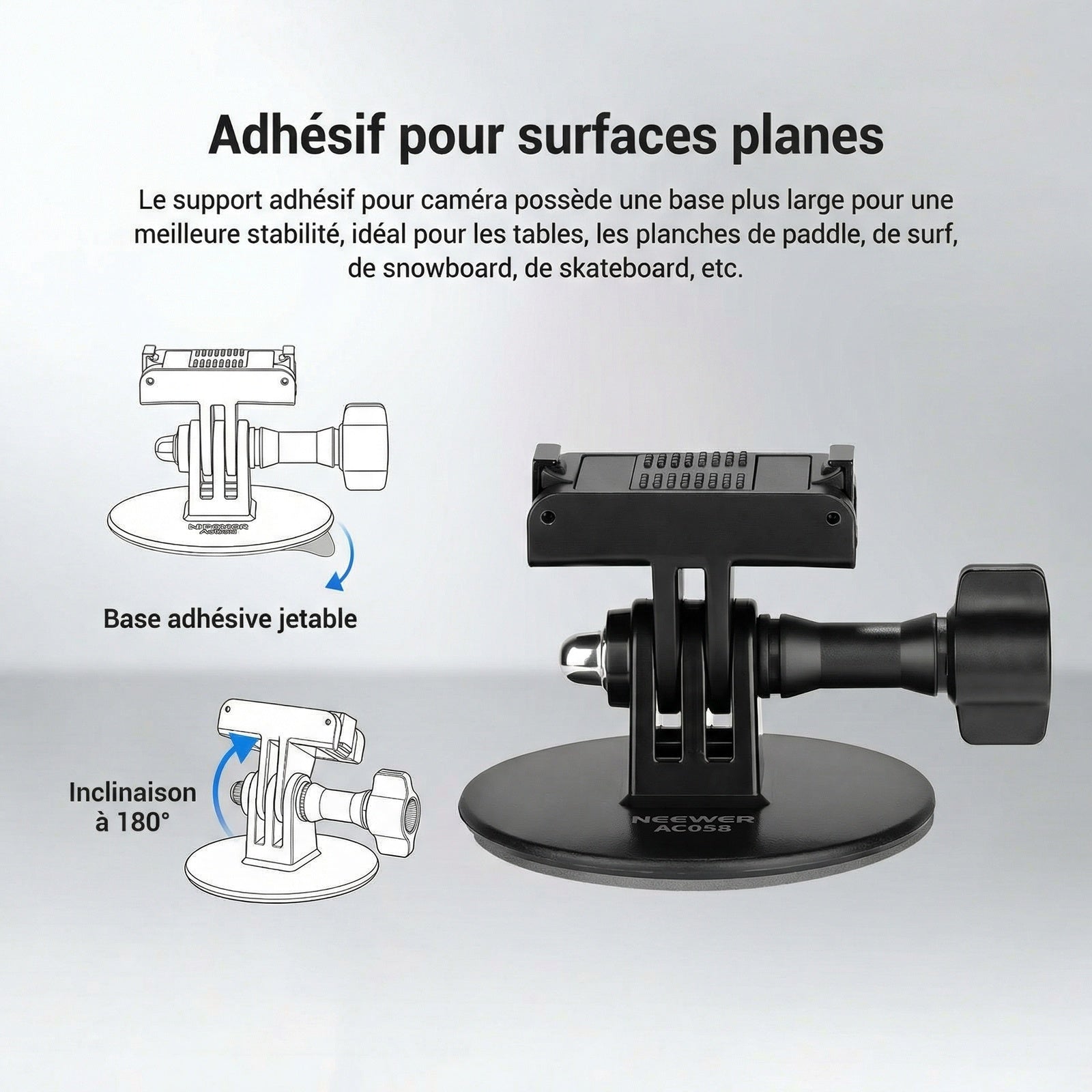 - 【Adhésif pour surfaces planes】 Grâce à sa base plus large, ce support adhésif offre une stabilité accrue et convient aux tables, planches de paddle, de surf, de snowboard, de skateboard, etc. Il permet également une inclinaison à 180° pour les prises de vue subjectives