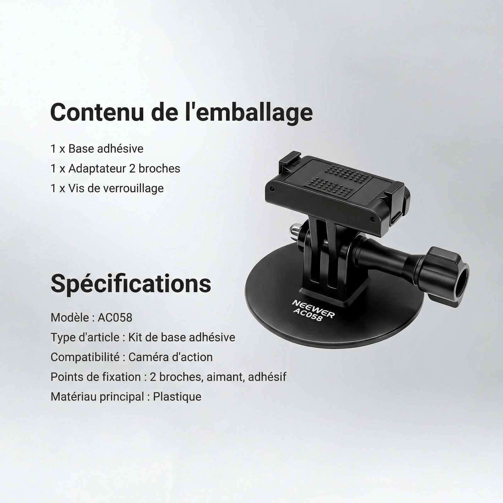 - 【Kit de fixation adhésive pour caméra d'action】 Ce kit comprend une base adhésive pour caméra d'action, un adaptateur magnétique à 2 broches et une vis de verrouillage, permettant de fixer solidement votre caméra d'action sur pratiquement n'importe quelle surface plane. Remarque : L'adhésif est jetable