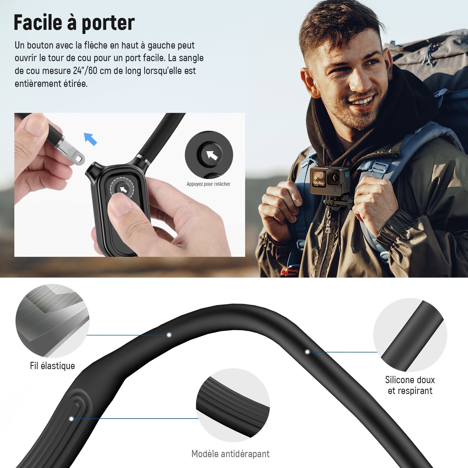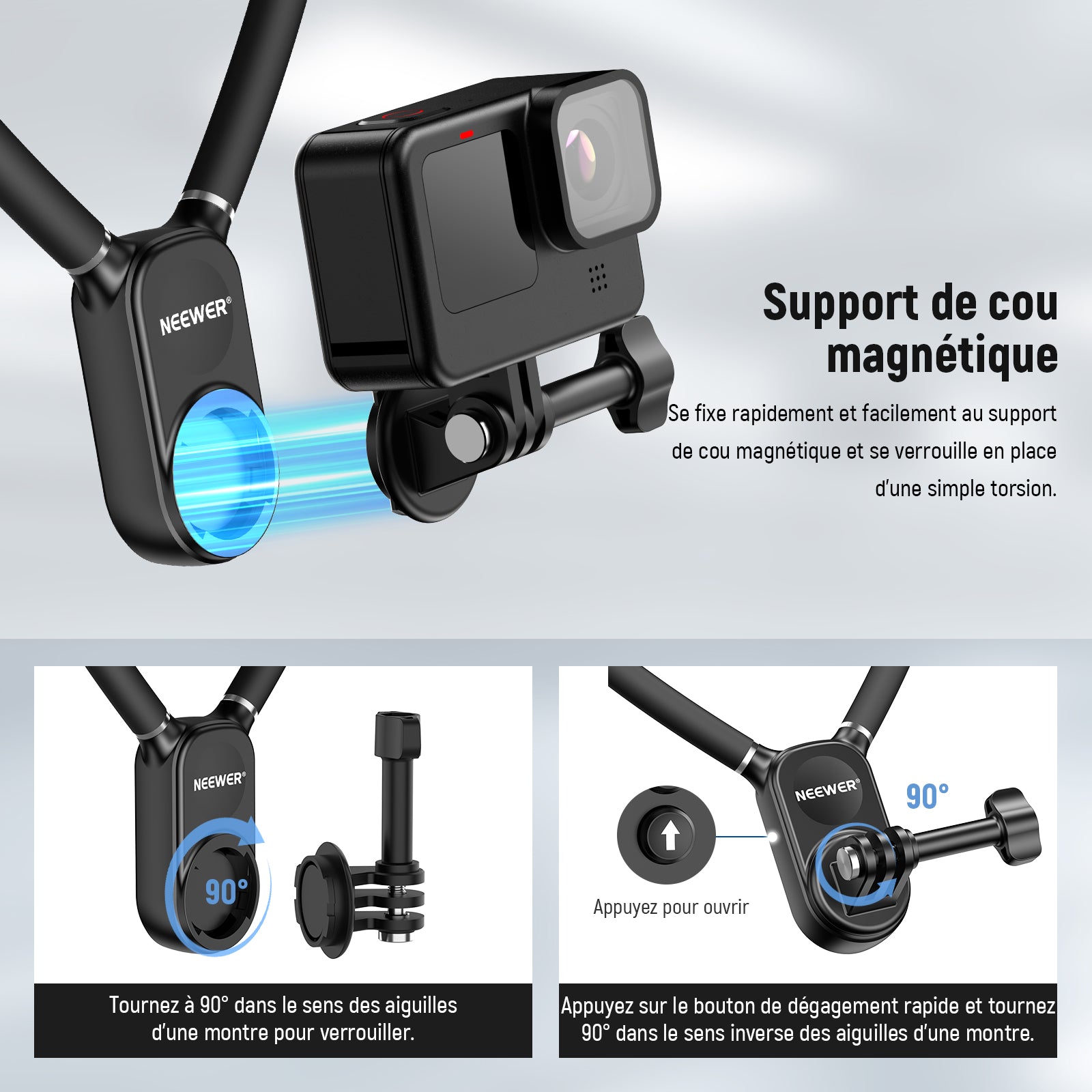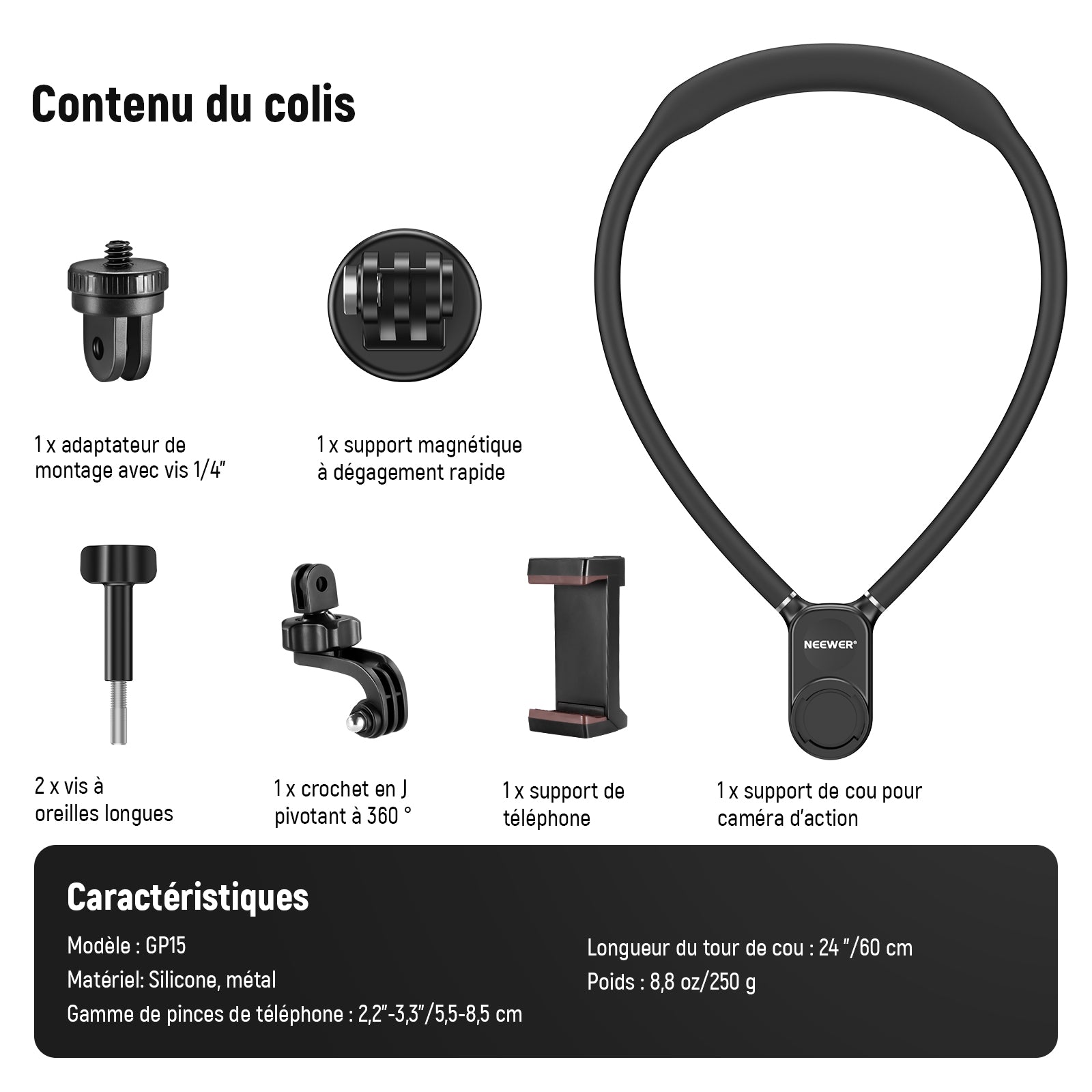 - Support de fixation au cou pour le point de vue POV- Le support de montage cervical NEEWER GP15 pour caméra d'action et téléphone peut être porté comme un collier pour des enregistrements vidéo POV et immersifs juste devant votre poitrine. Il dispose d'un bouton de libération rapide (flèche en haut à gauche) qui permet de détacher la sangle du cou pour un port sans effort. La sangle du cou mesure 24" (60 cm) lorsqu'elle est complètement étirée