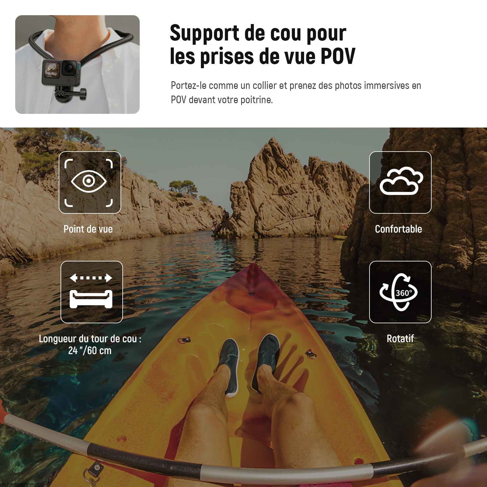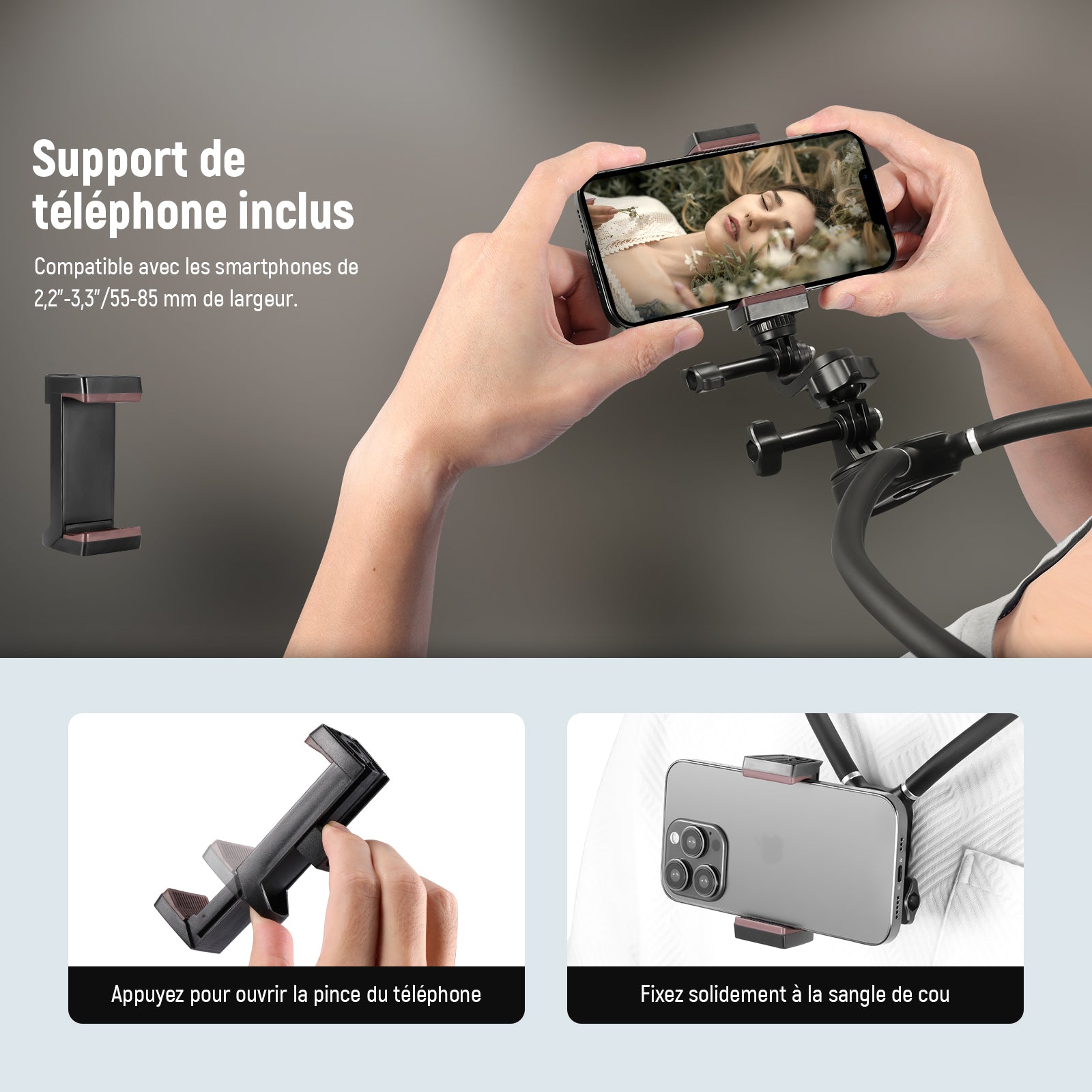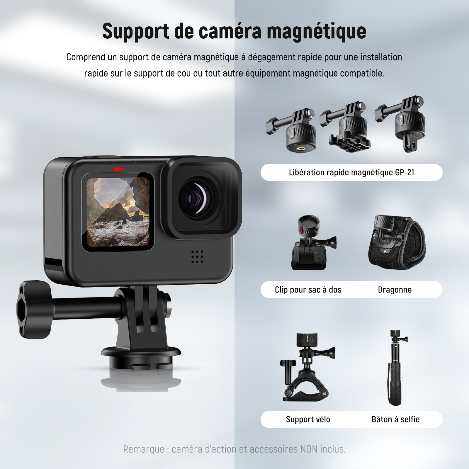 - Support de fixation au cou pour le point de vue POV- Le support de montage cervical NEEWER GP15 pour caméra d'action et téléphone peut être porté comme un collier pour des enregistrements vidéo POV et immersifs juste devant votre poitrine. Il dispose d'un bouton de libération rapide (flèche en haut à gauche) qui permet de détacher la sangle du cou pour un port sans effort. La sangle du cou mesure 24" (60 cm) lorsqu'elle est complètement étirée