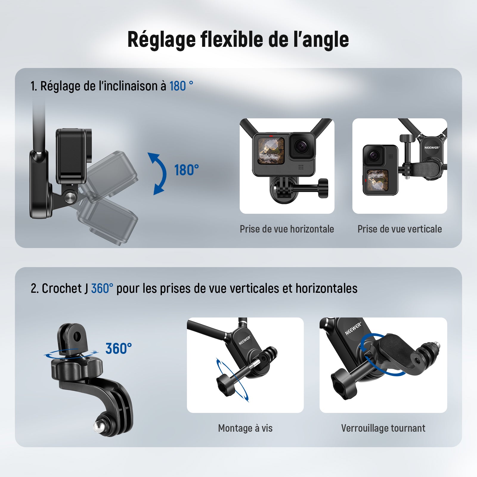 - Ajustement flexible de l'angle - Le support pour caméra d'action peut s'incliner à 180° pour un ajustement flexible de l'angle. Un crochet en J pivotant à 360° vous permet de convertir les positions de la caméra d'action pour des prises de vue verticales ou horizontales.
