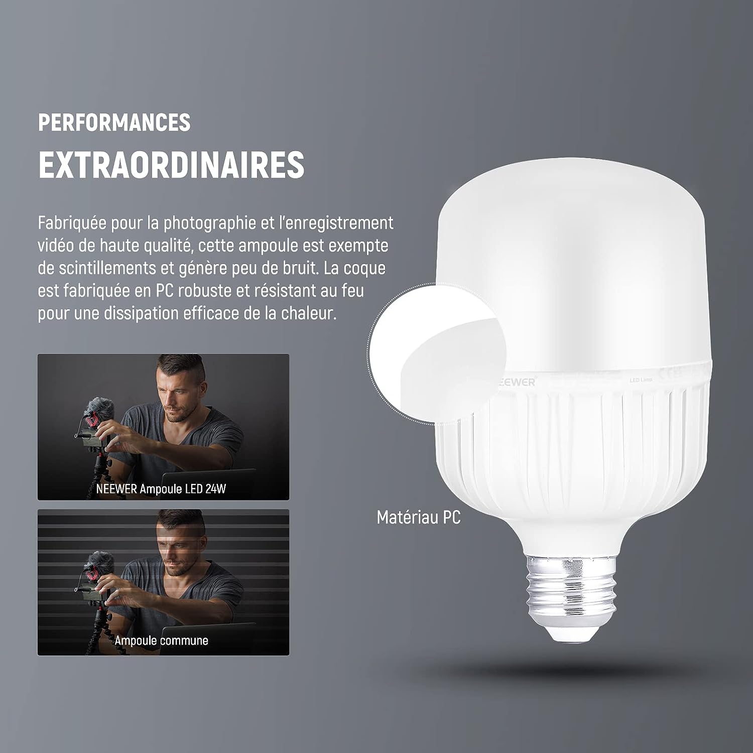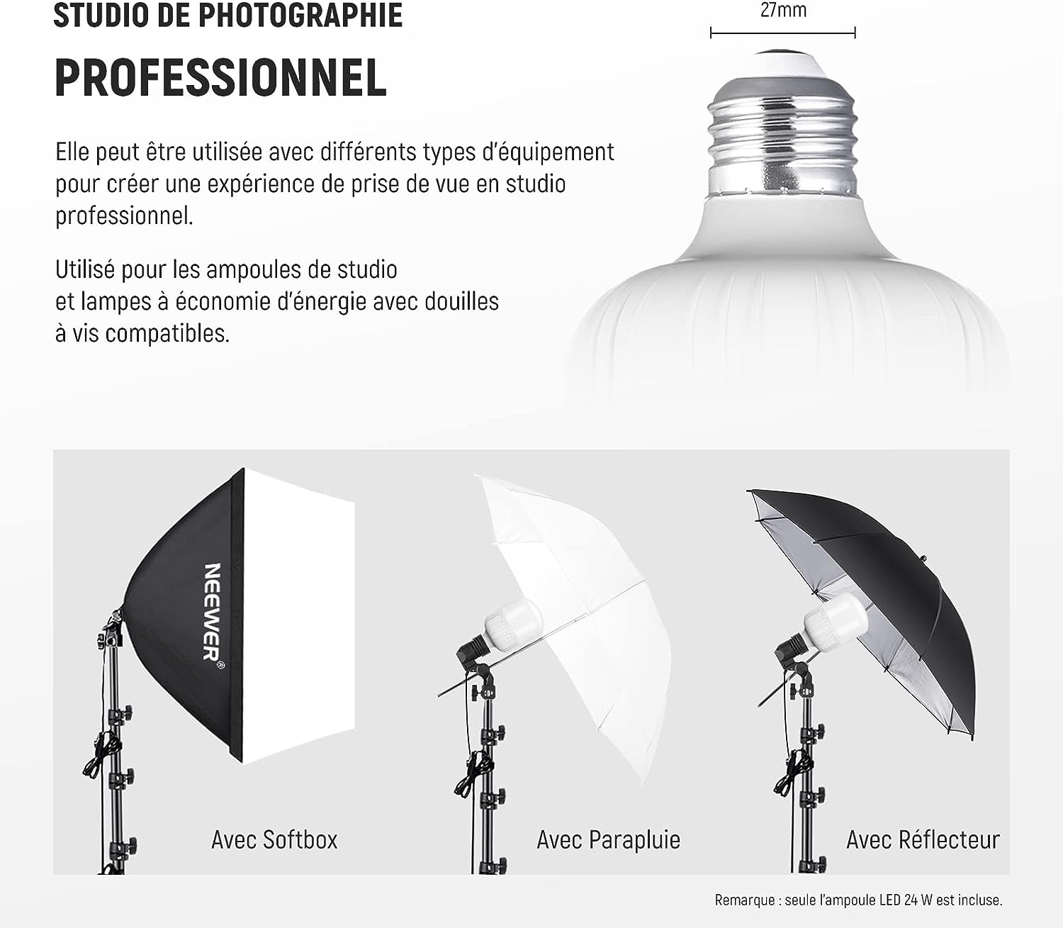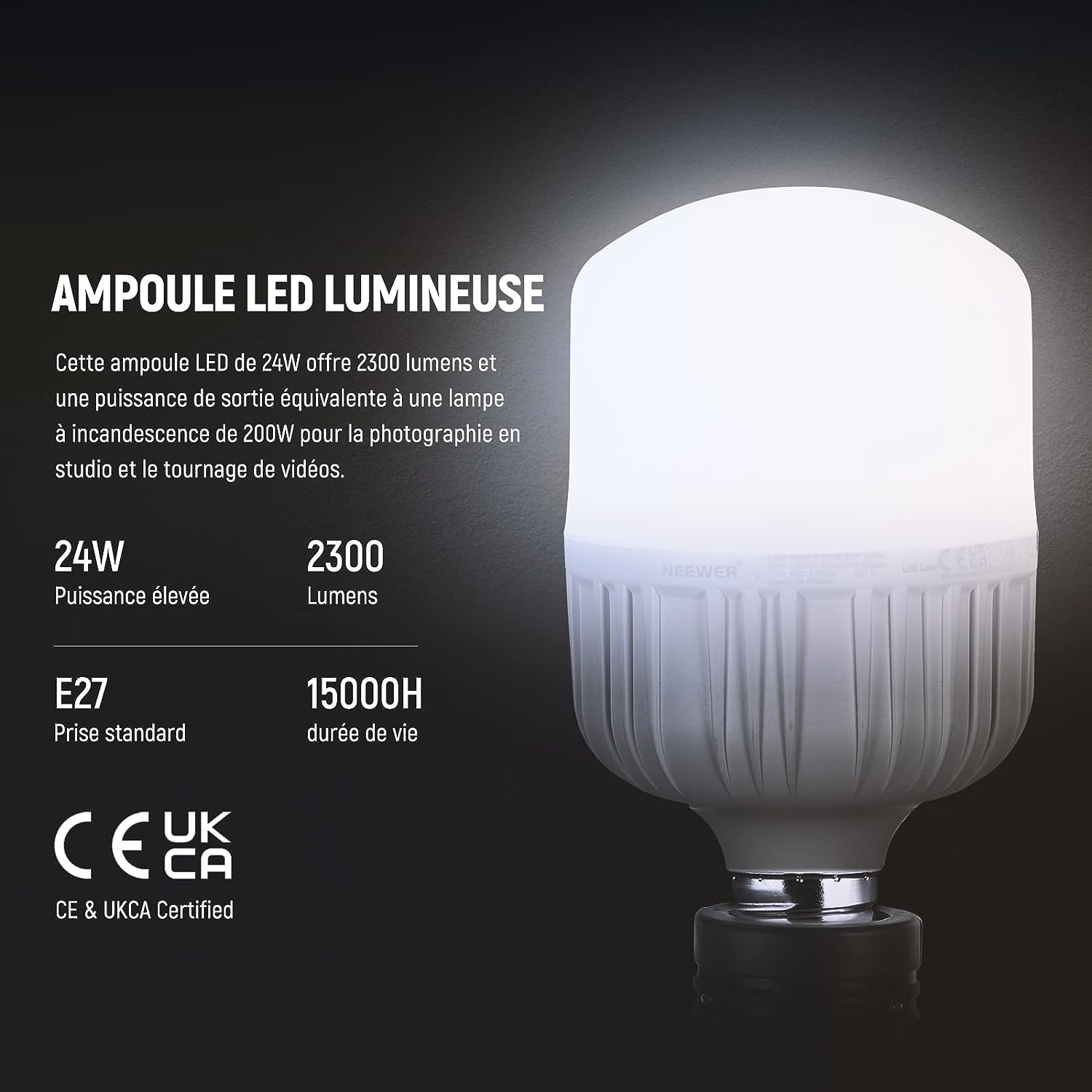 • Ampoule LED 24W certifiée CE&UKCA- Cette ampoule LED 24W certifiée CE&UKCA a une puissance équivalente à une lampe à incandescence de 200W et apporte 2300 lumens pour la photographie en studio et le tournage de vidéos. Vissez cette ampoule dans une douille E27 standard pour un éclairage lumineux et constant sans scintillement