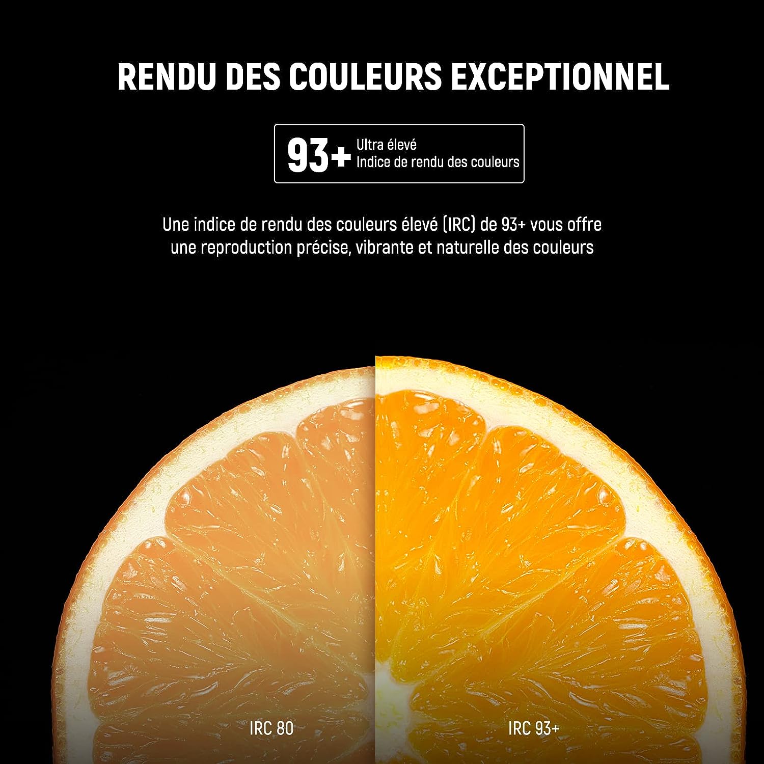 • Fidélité des couleurs exceptionnelle- L'indice de rendu des couleurs (CRI) élevé de 93+ vous offre une reproduction précise, vibrante et naturelle des couleurs.