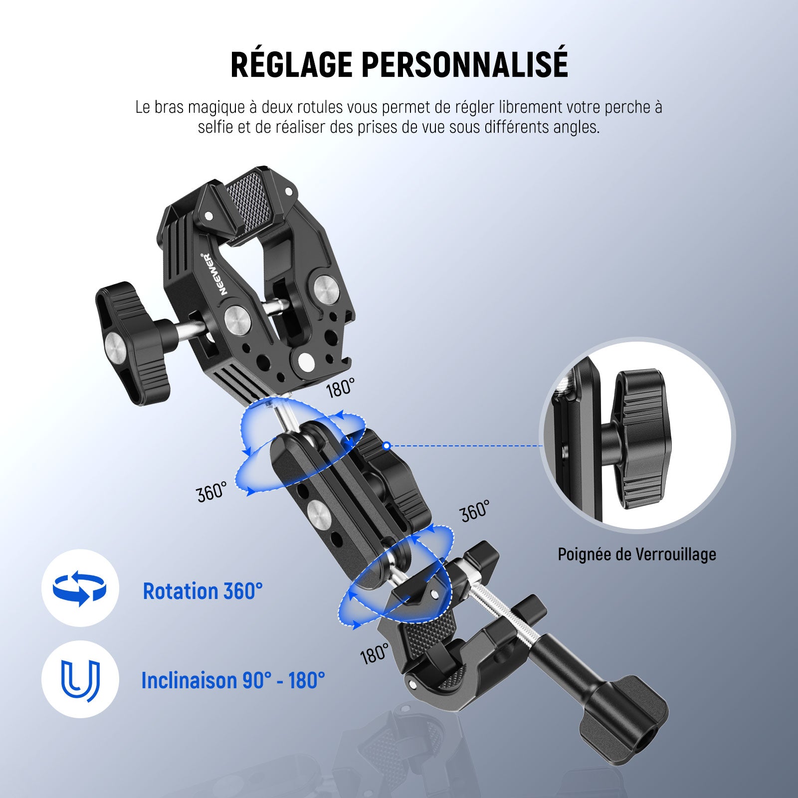 - 【Hauteur et angle réglables】 Il suffit de tourner pour étendre la tige télescopique à 4 sections de 14,8"/37,5 cm à 41,5"/105,5 cm et d'ajuster les deux rotules rotatives à 360° sur le bras magique pour une flexibilité de prise de vue optimale. Fixez les rotules en place à l'aide des boutons à vis pour une position stable de la caméra pendant votre trajet