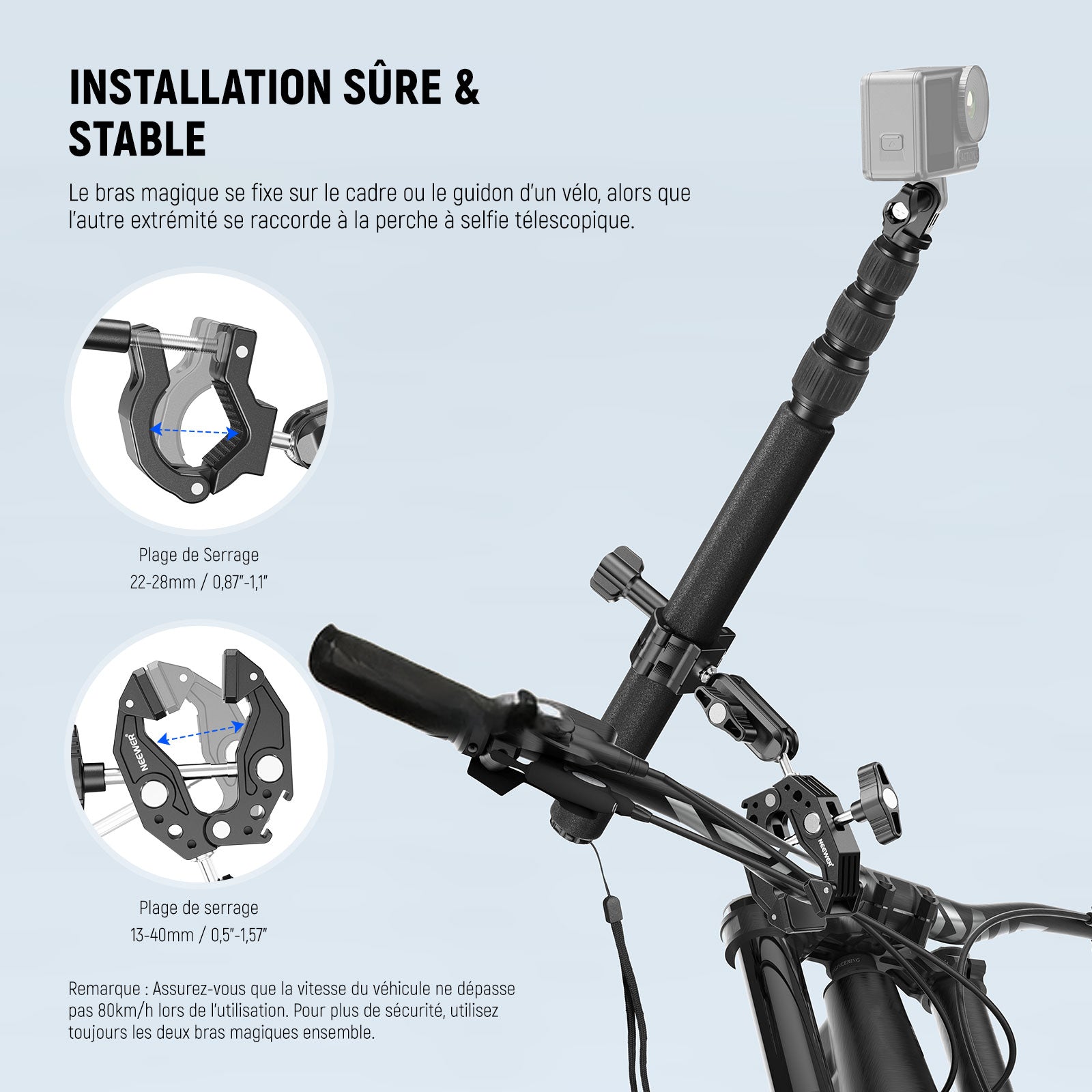 - 【Montage fiable et stable】 Chaque bras magique avec deux pinces pour une fixation sécurisée. Une extrémité se connecte à l'un des guidons de vélo (0,5"-1,57"/13-40mm), tandis que l'autre extrémité se fixe au bâton de selfie télescopique (0,87"-1,1"/22-28mm), le tout verrouillé par des boutons de serrage à la main, assurant un montage fiable et stable pour votre caméra d'action