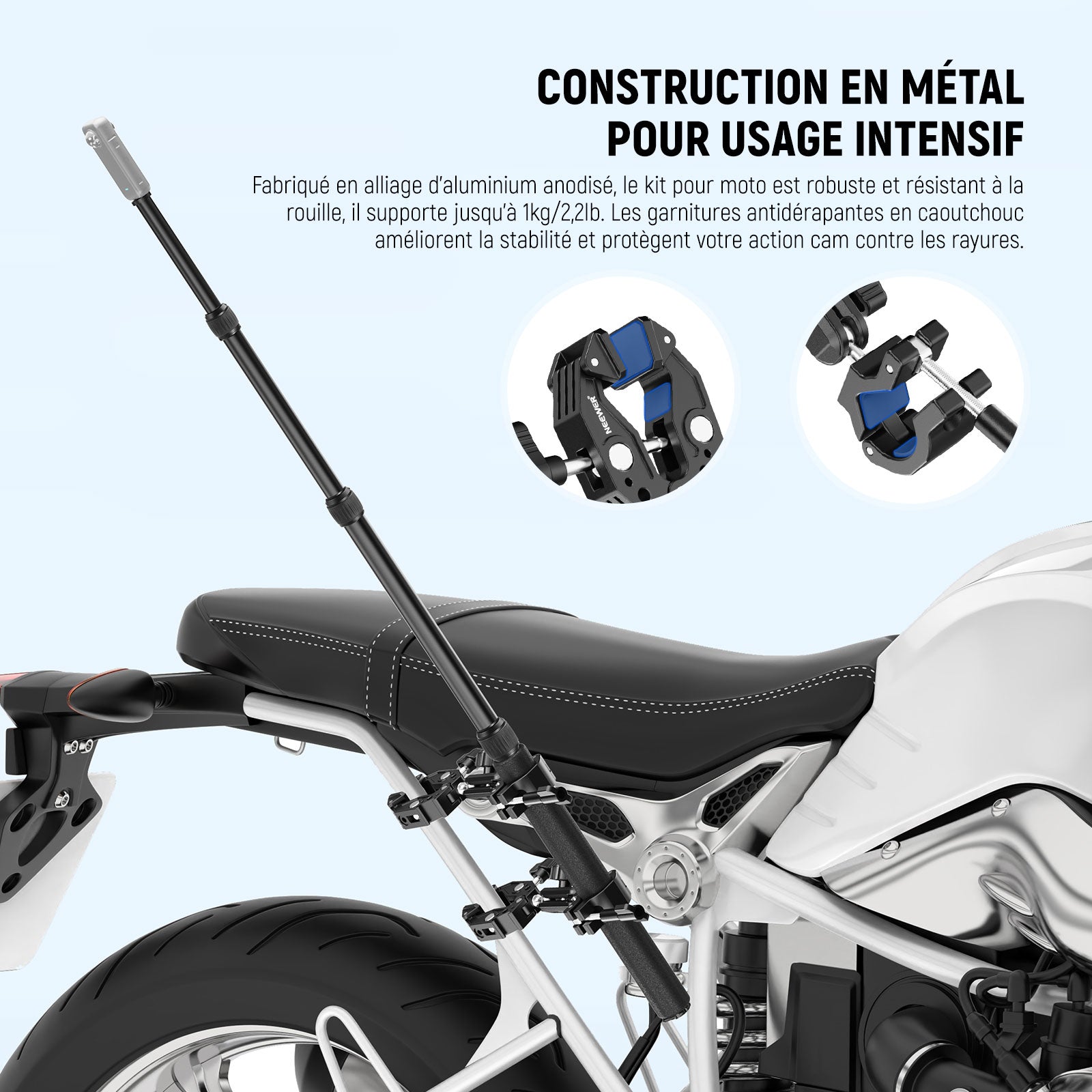- 【Construction en métal robuste】 Fabriqué en alliage d'aluminium anodisé noir, le kit moto est robuste, résistant à la rouille et supporte jusqu'à 2,2 lb/1 kg. Le tout recouvert de coussinets en caoutchouc antidérapants, le bâton de selfie télescopique et les bras magiques offrent une stabilité améliorée et protègent votre caméra d'action des rayures