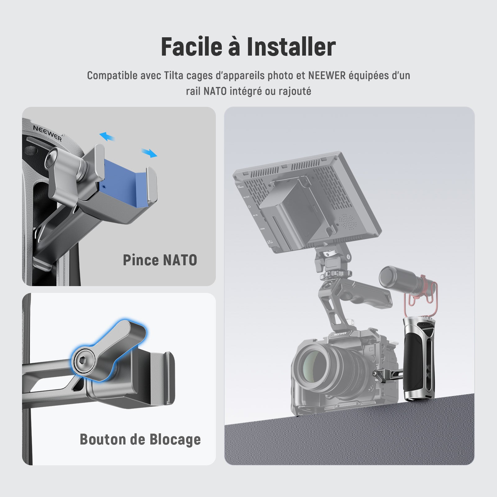 - 【Pince NATO à Démontage Rapide】 La pince NATO peut être fixée rapidement et solidement à une cage d'appareil photo NEEWER avec des rails NATO intégrés ou rajoutés. Aussi compatible avec SmallRig cages d'appareil photo; compatible avec Tilta cages d'appareil photo.