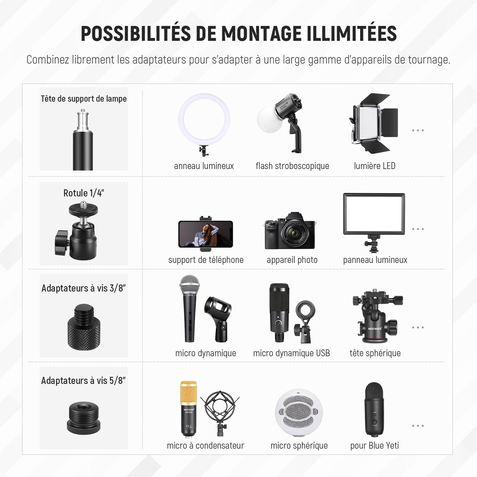 - 【Large compatibilité】 avec les deux têtes sphériques de 1/4" incluses, couplées à des adaptateurs à vis de 1/4" à 3/8" et des adaptateurs à vis de 1/4" à 5/8", les supports de montage de table peuvent se connecter aux appareils photo reflex numériques , supports de téléphone, anneaux lumineux, éclairages de touches, microphones, têtes de trépied (tous non inclus), etc. Idéal pour la diffusion en direct, le vlogging, l'enregistrement vidéo Youtube TikTok, la photographie aérienne sur table.