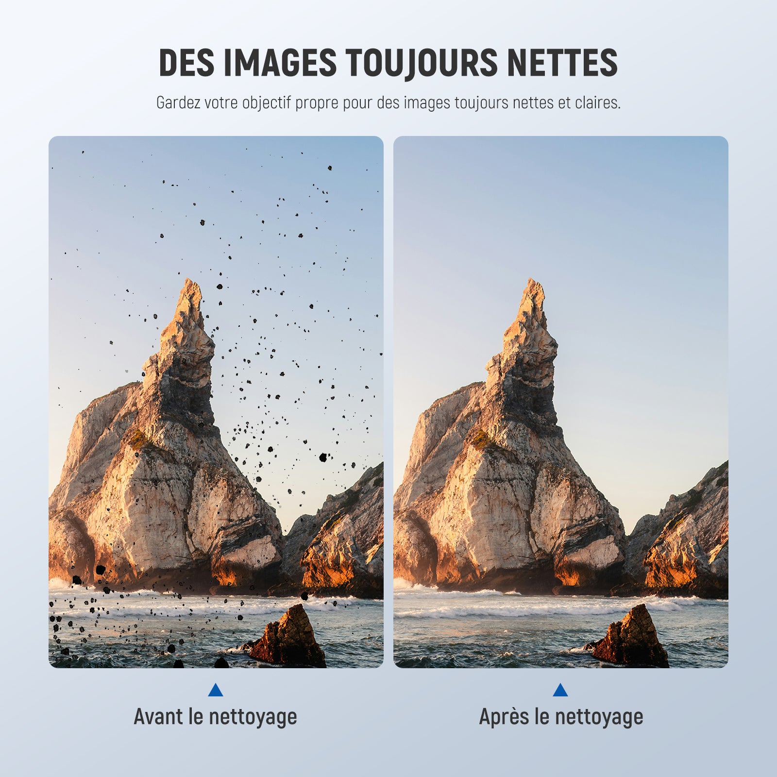 - Spray nettoyant sans alcool : le spray nettoyant de 20 ml adopte une formule sans alcool pour enlever les taches de tous les types de lentilles sans laisser de traces. Vaporisez directement sur l'objectif et essuyez avec les chiffons inclus