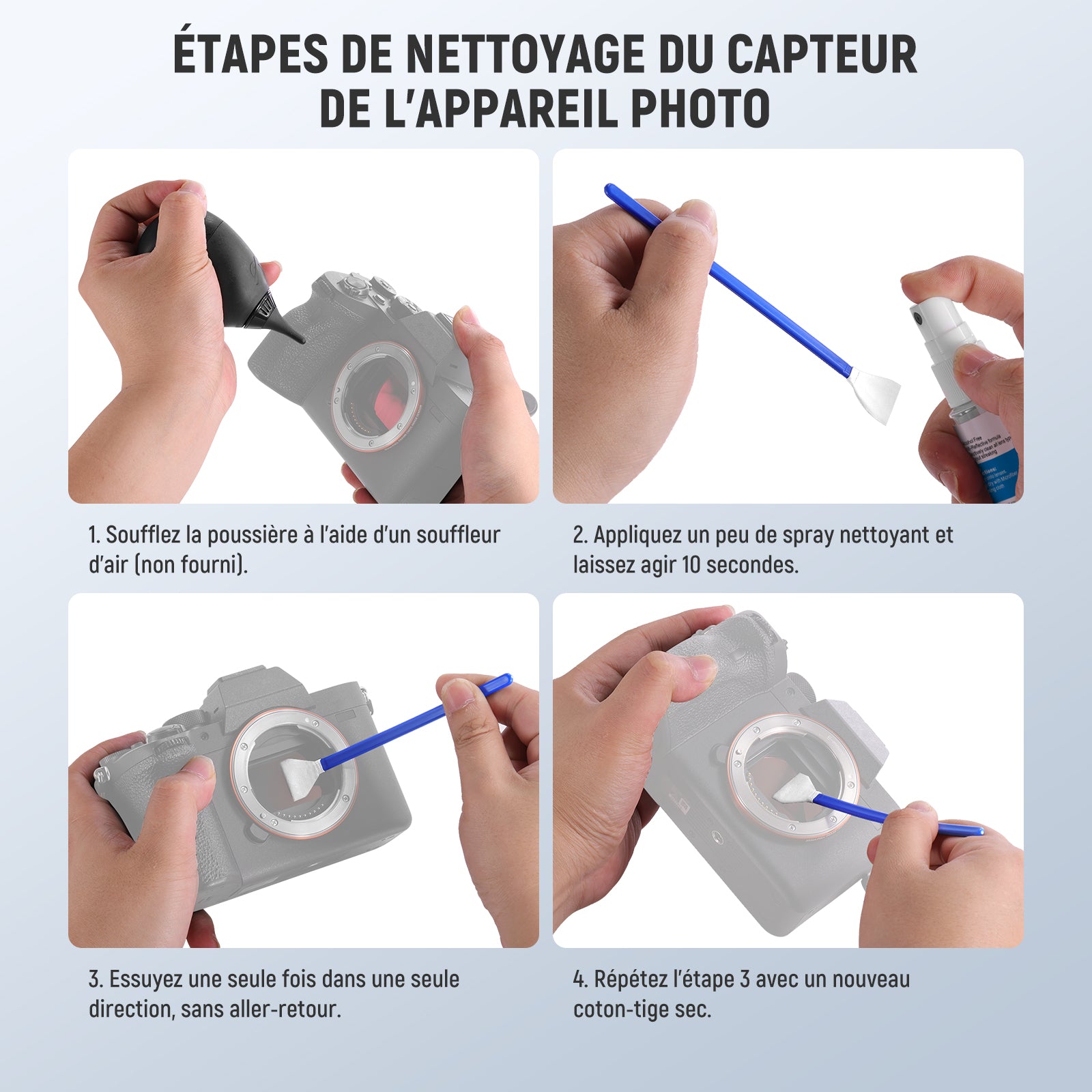 - 【Kit de nettoyage professionnel pour appareil photo】 Le kit d'accessoires de nettoyage comprend 10 tampons de nettoyage pour capteur plein format de 24 mm, 1 spray nettoyant, 1 chiffon de nettoyage — peut être utilisé en toute sécurité sur tous les appareils électroniques, les objectifs enduits et les capteurs de caméra