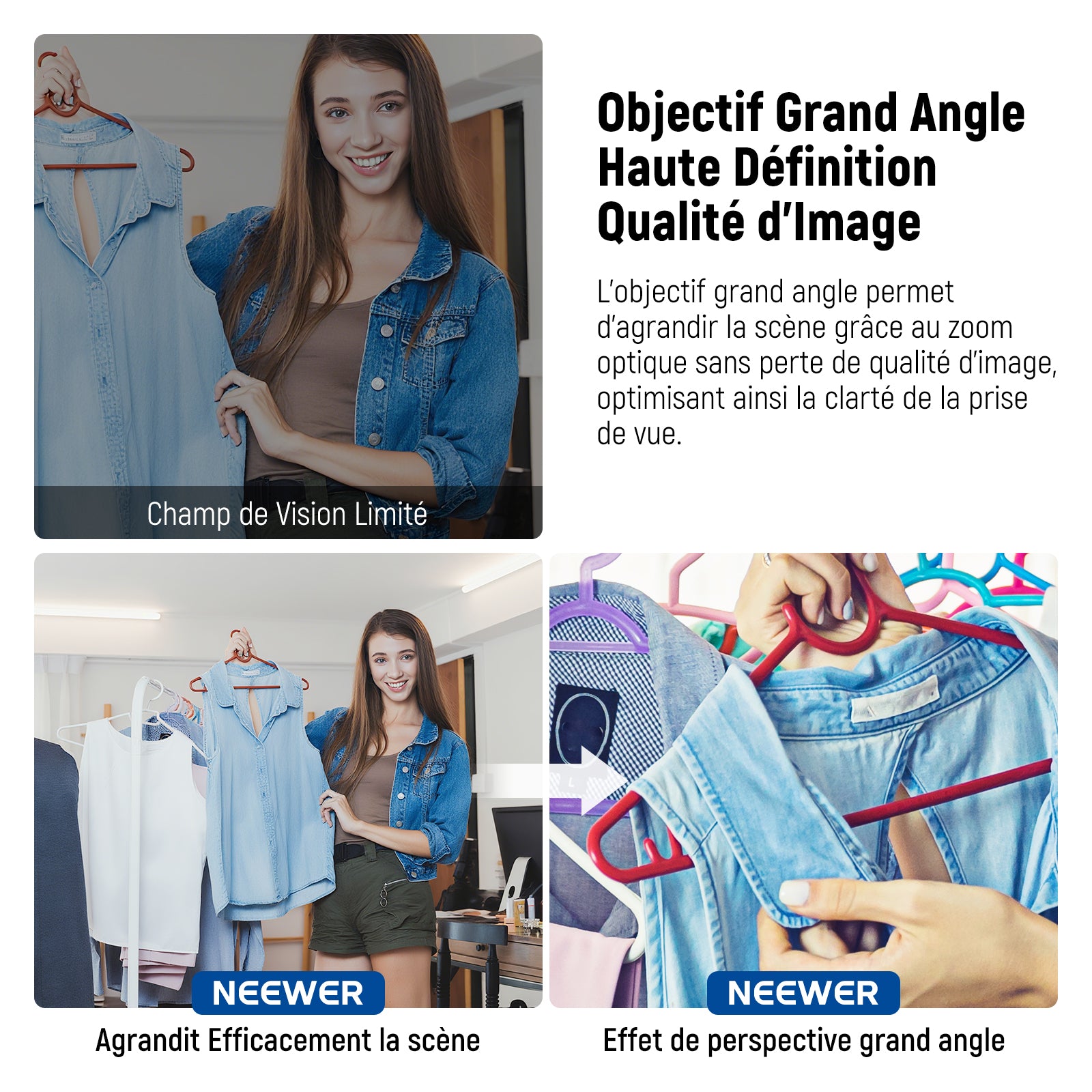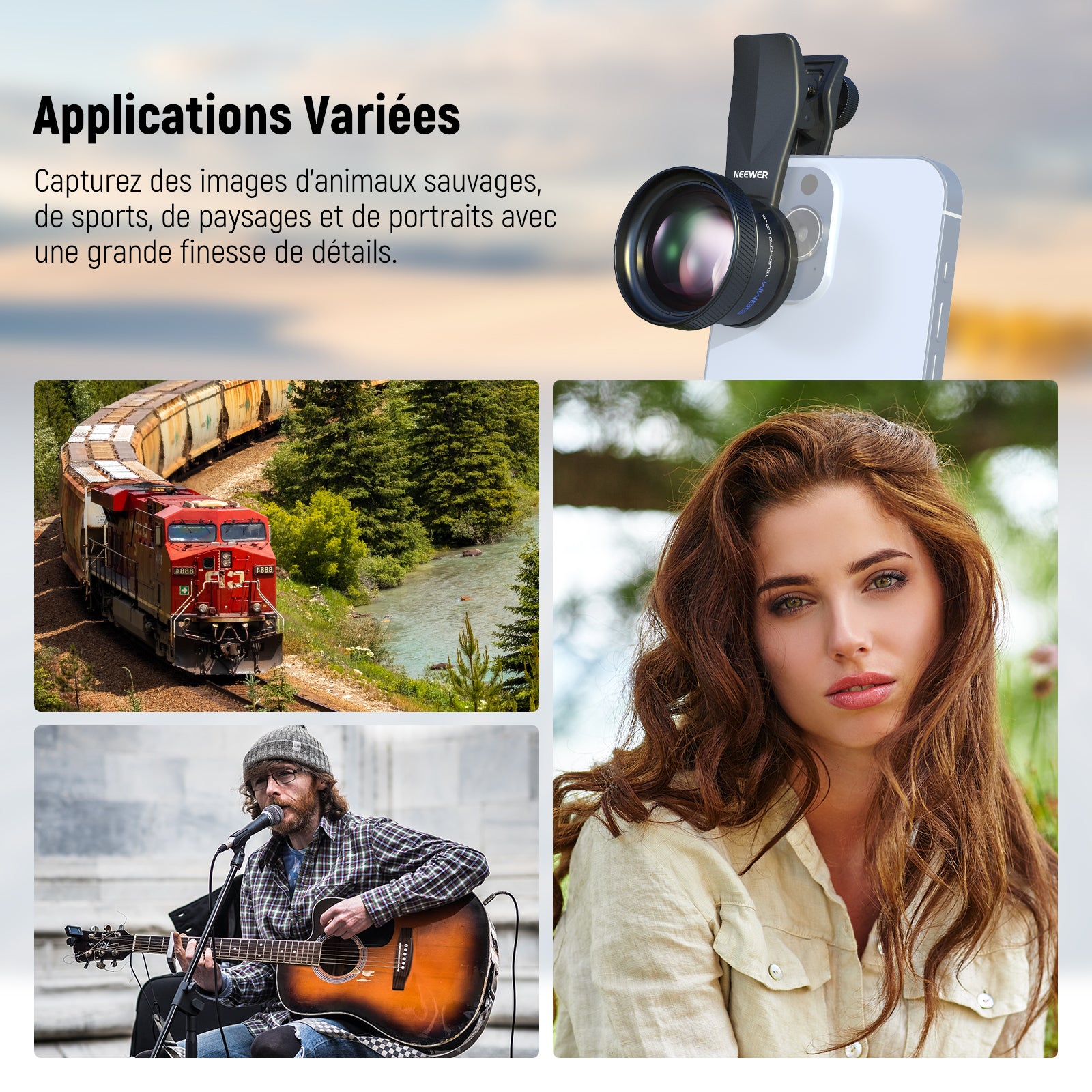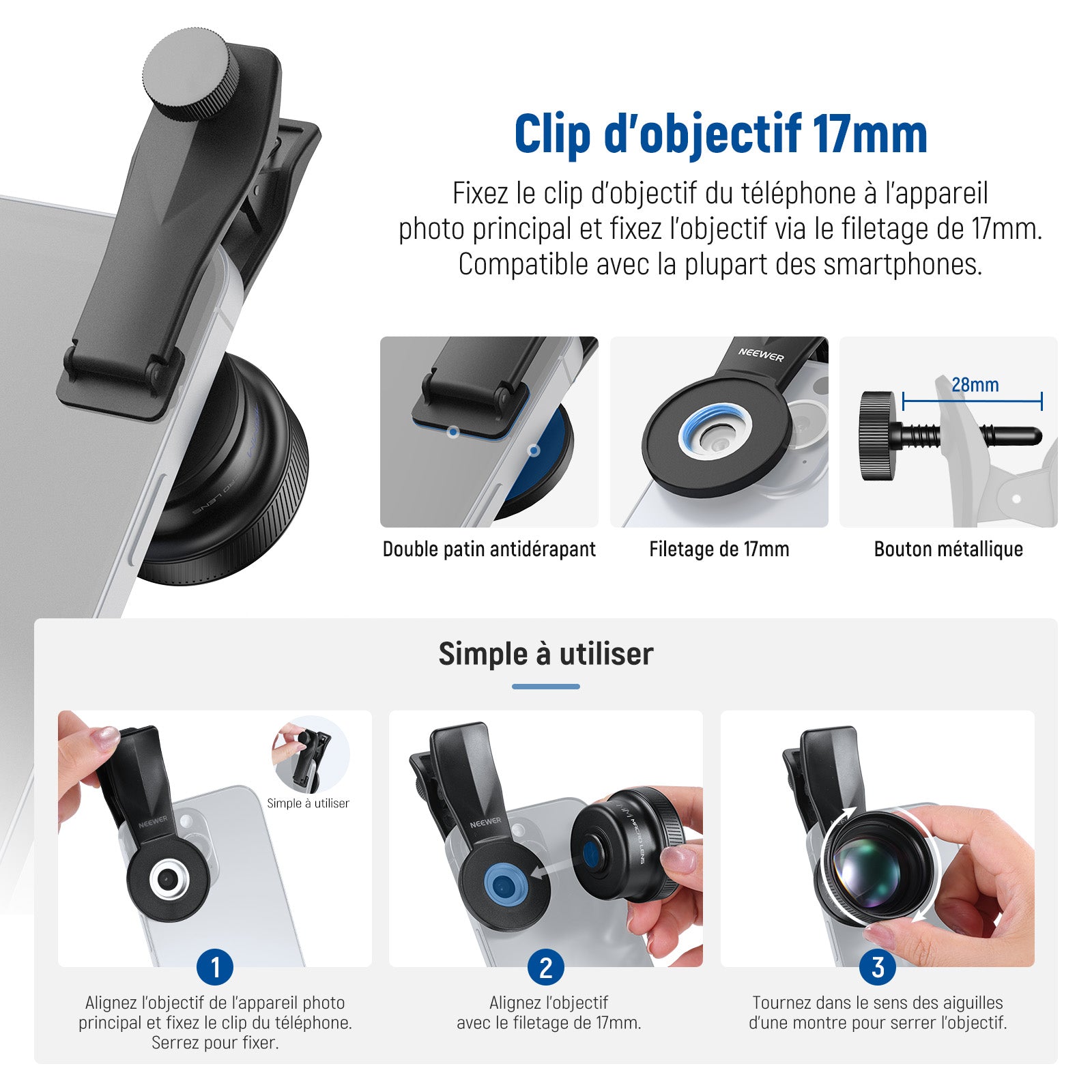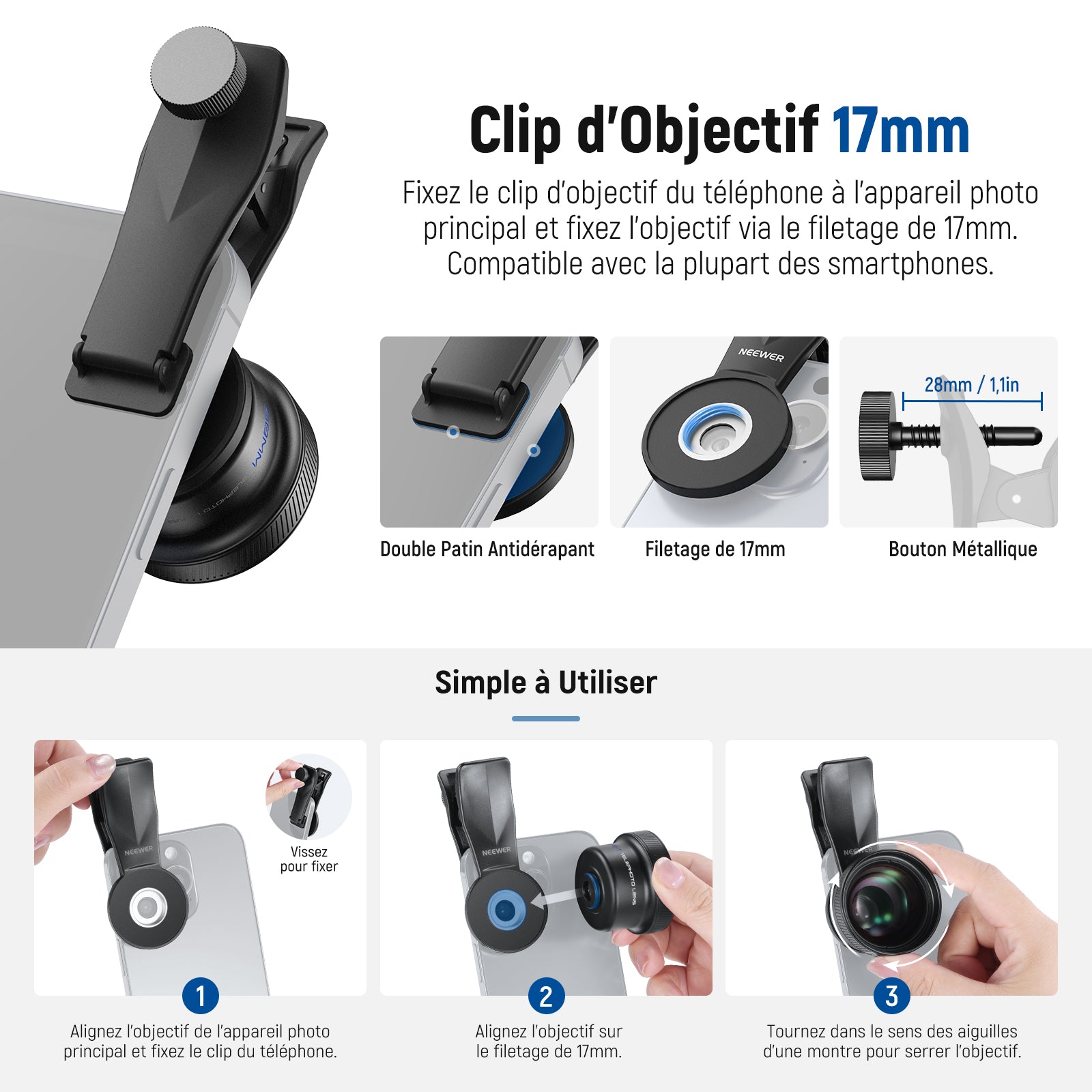 Les objectifs pour téléphone NEEWER sont conçus avec un cadre en alliage d'aluminium durable, résistant à la rouille et aux rayures. Ces objectifs garantissent une reproduction précise des couleurs pour des vidéos et photos nettes et vibrantes. Notre collection comprend des objectifs macro probe, des objectifs grand angle et bien plus. Choisissez un objectif professionnel pour sublimer votre photographie mobile.