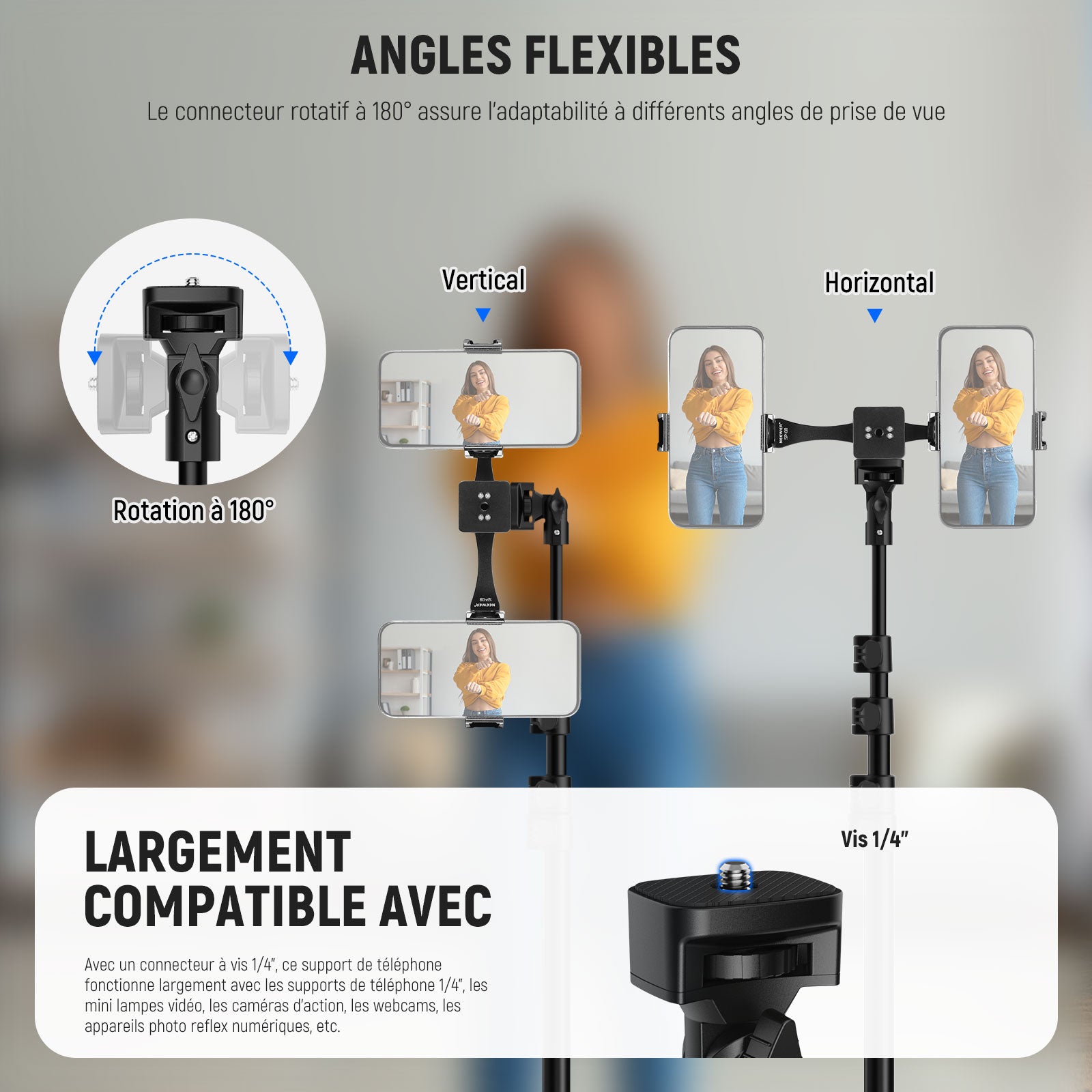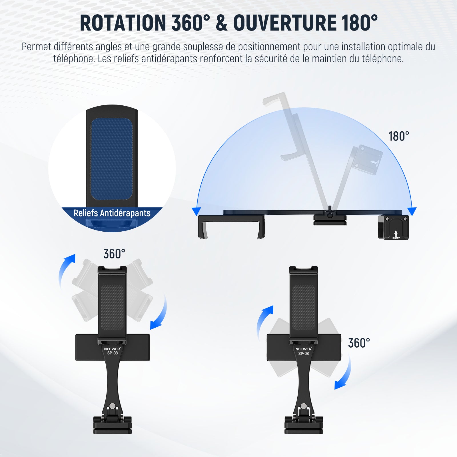 - 【Grande Compatibilité】 Le support de téléphone SP-08 de NEEWER a deux pinces pour fixer deux téléphones simultanément, fabriqué en métal de qualité supérieure. Les pinces s'écartent de 6cm à 9,5cm, compatibles avec iPhone 16 15 Pro Max Samsung Galaxy S23 S24, compatibles avec Google Pixel... Elles tournent sur 360° et pivotent à 180° pour une polyvalence optimale pour la fixation du téléphone. Parfait pour le direct sur deux plateformes ou pour utiliser un téléphone comme téléprompteur.