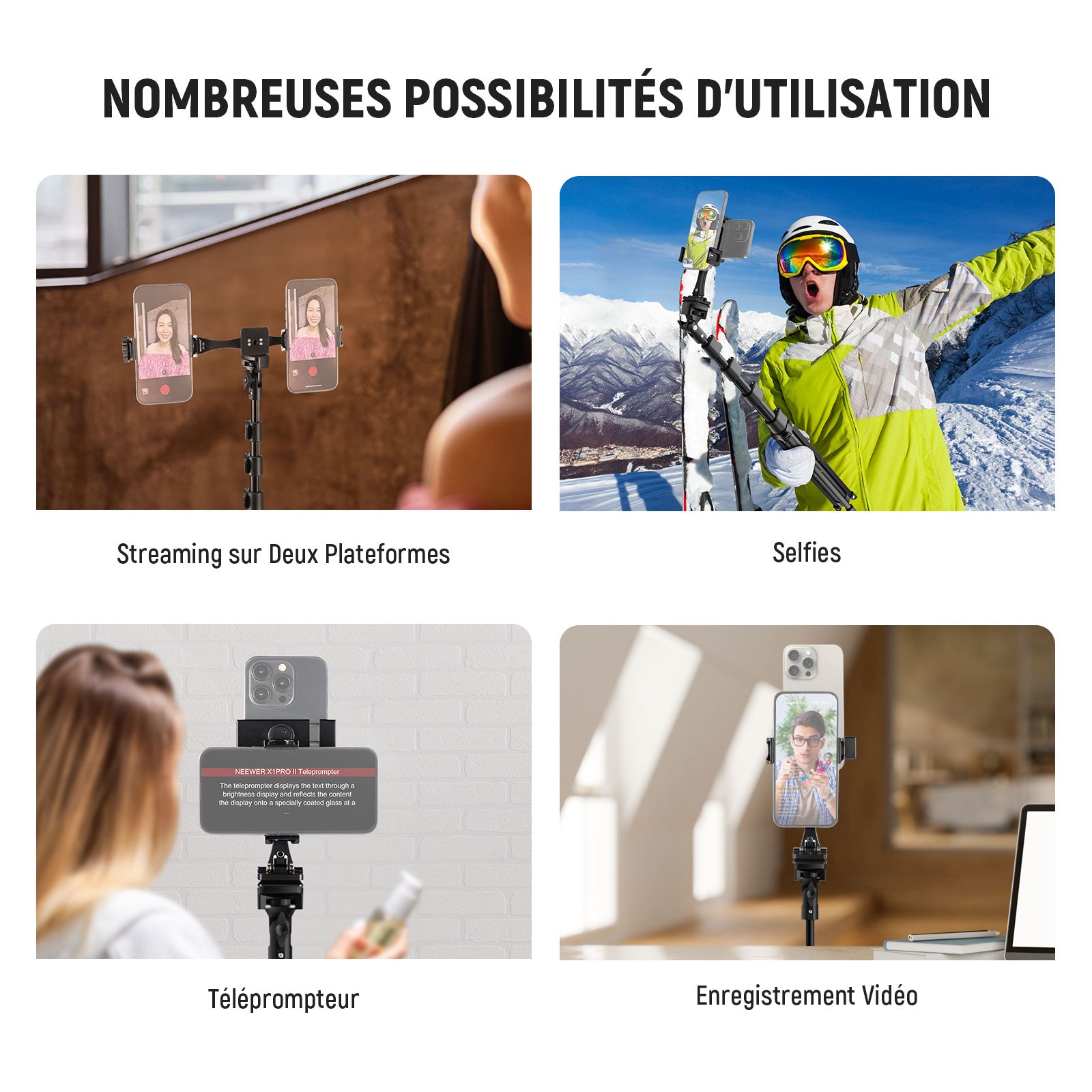- 【Fonction Téléprompteur】 Ce support pour téléphone portable à double fonction est conçu pour accueillir un téléphone pour filmer et l'autre pour servir de téléprompteur portable. Vous pouvez lire facilement vos scripts lors de l'enregistrement, ce qui garantit des streamings en direct et des présentations vidéo professionnels et sans accroc. Téléchargez "NEEWER Teleprompter" depuis votre APP store, vous pourrez ainsi utiliser gratuitement la fonction téléprompteur sur votre téléphone.