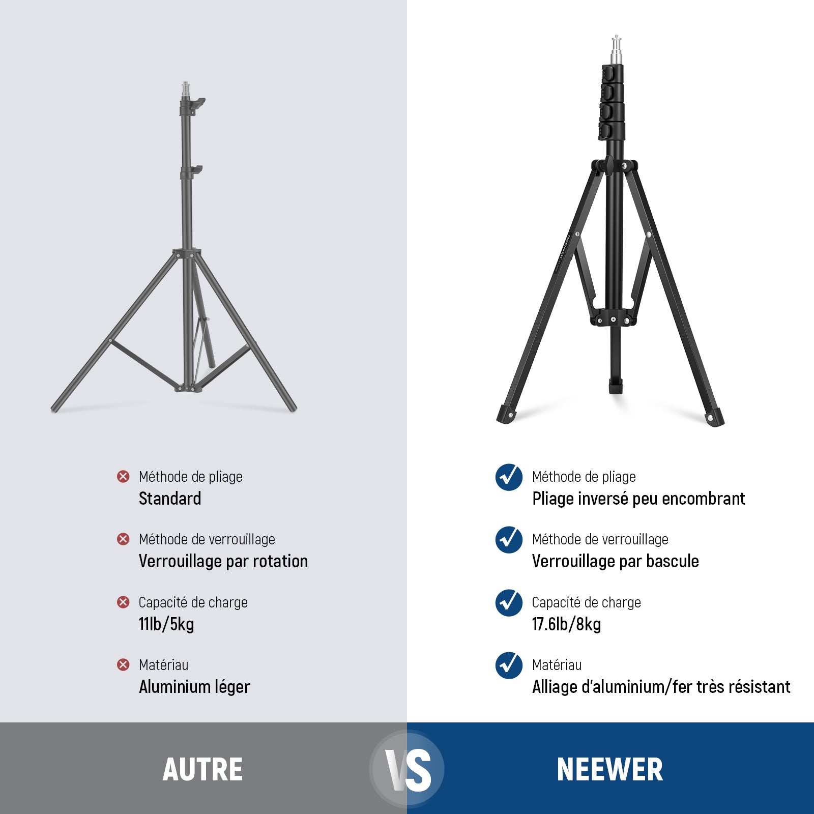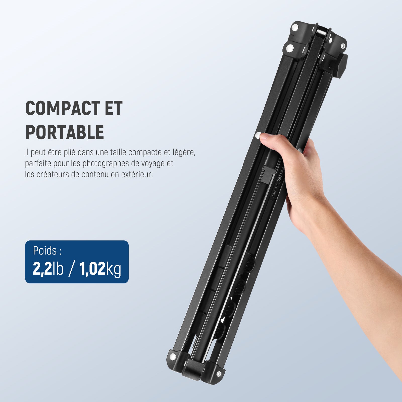 • 【Support portable avec pieds rétractables】 Le support d'éclairage NEEWER ST180R est pliable et peut être plié à plat grâce à ses pieds pliables inversés, occupant un minimum d'espace pour une portabilité améliorée et un stockage efficace, adapté aux voyages et aux prises de vue en extérieur