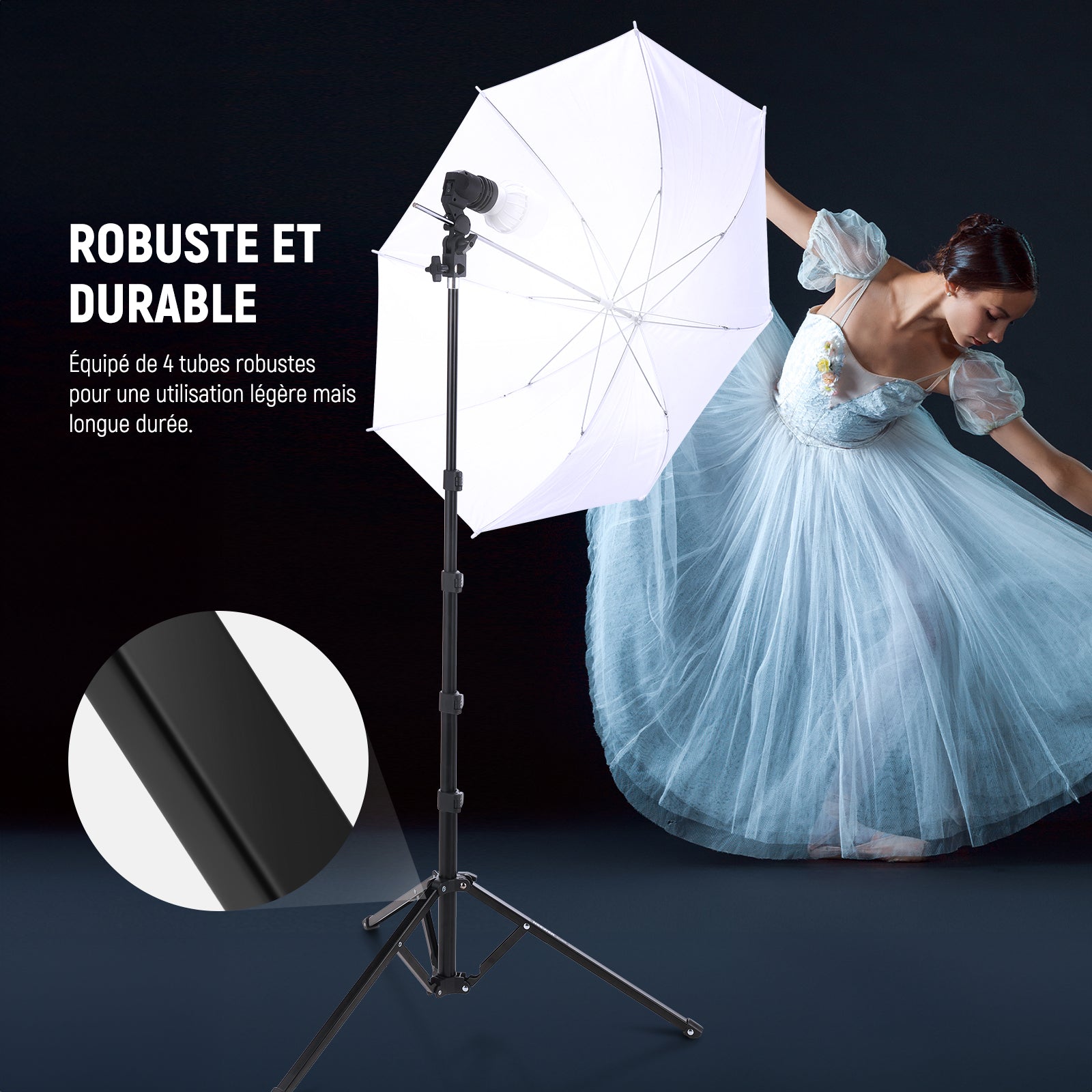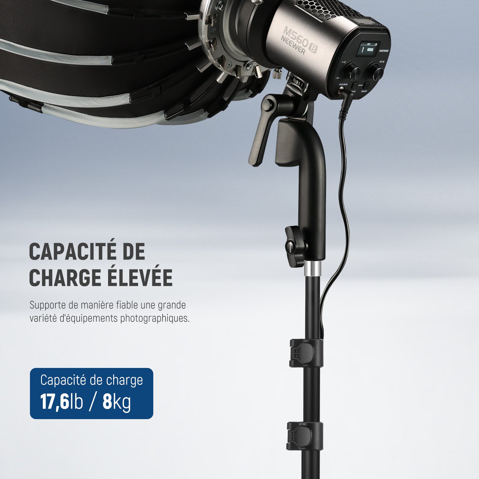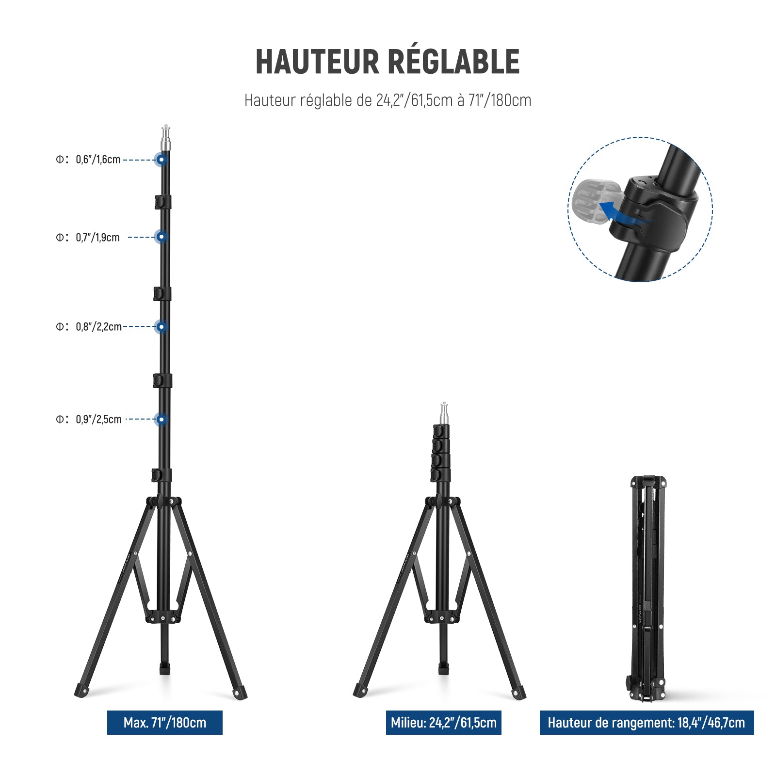 • 【Mécanisme de verrouillage à rabat sécurisé】ce support d'éclairage photographique dispose de 4 verrous à rabat sur la colonne centrale pour un réglage et un verrouillage rapides et sécurisés de la hauteur